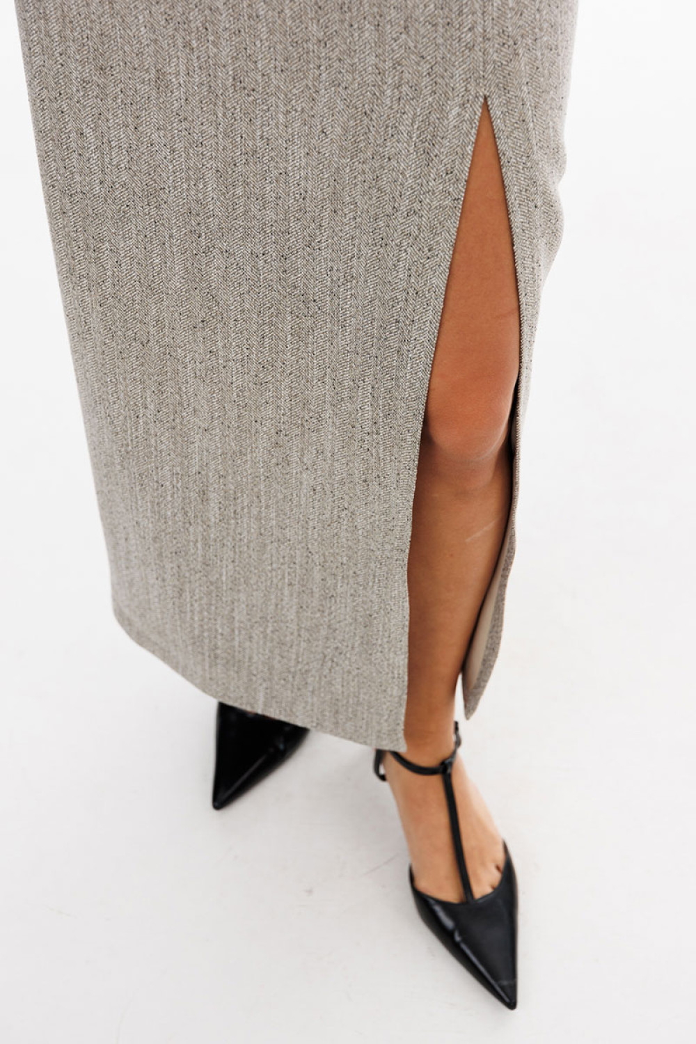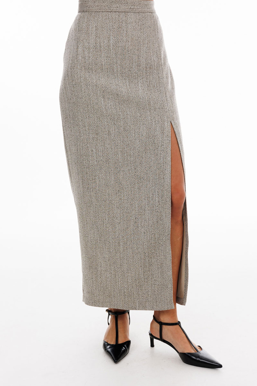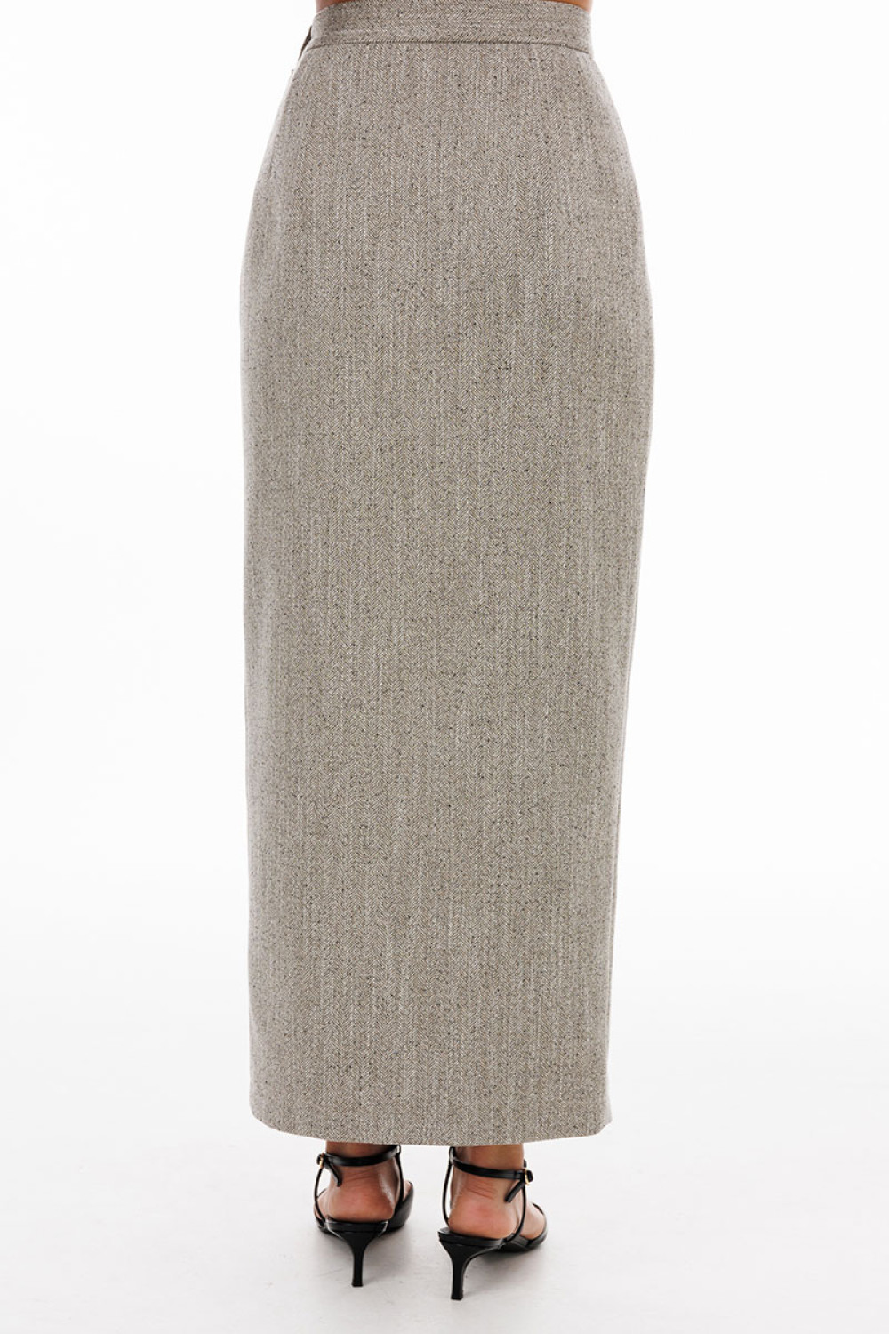 Юбка выполнена из костюмной ткани меланж с рисунком "елочка". Юбка на притачном поясе, длиной выше линии щиколотки, зауженная к низу. Застежка сбоку на потайную молнию. Спереди слева разрез. Юбка на притачной по низу подкладке.