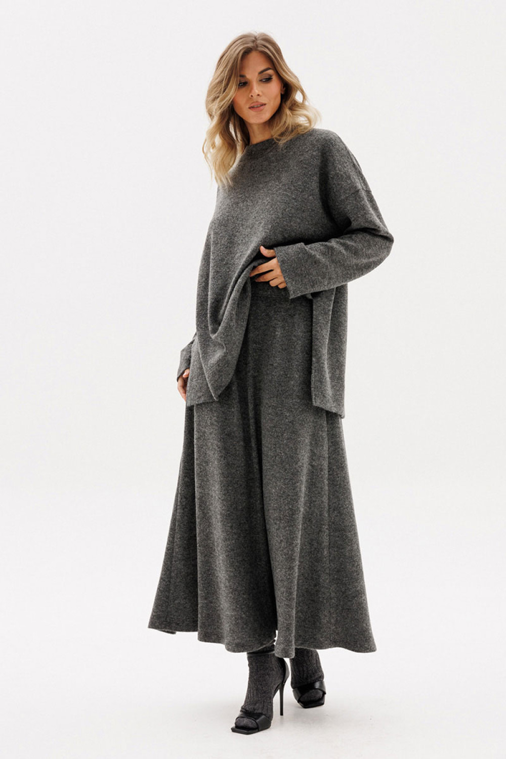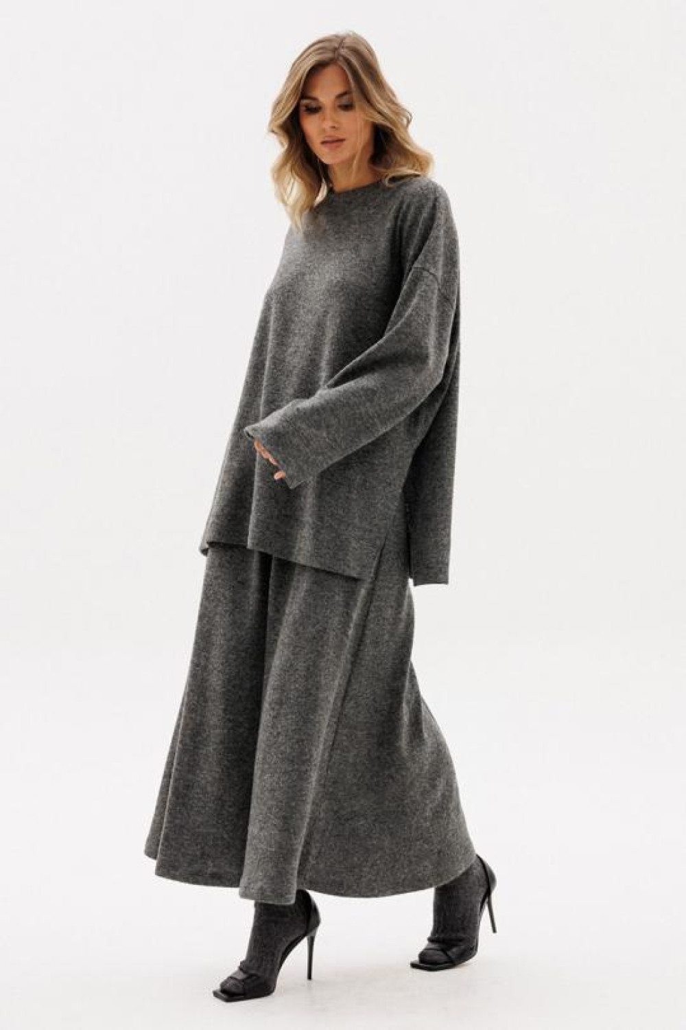 Юбка выполнена из трикотажного полотна. Юбка-годе А-образного силуэта, длиной миди, на цельнокроеном поясе с эластичной тесьмой. Юбка состоит из четырех клиньев, юбка без подкладки.