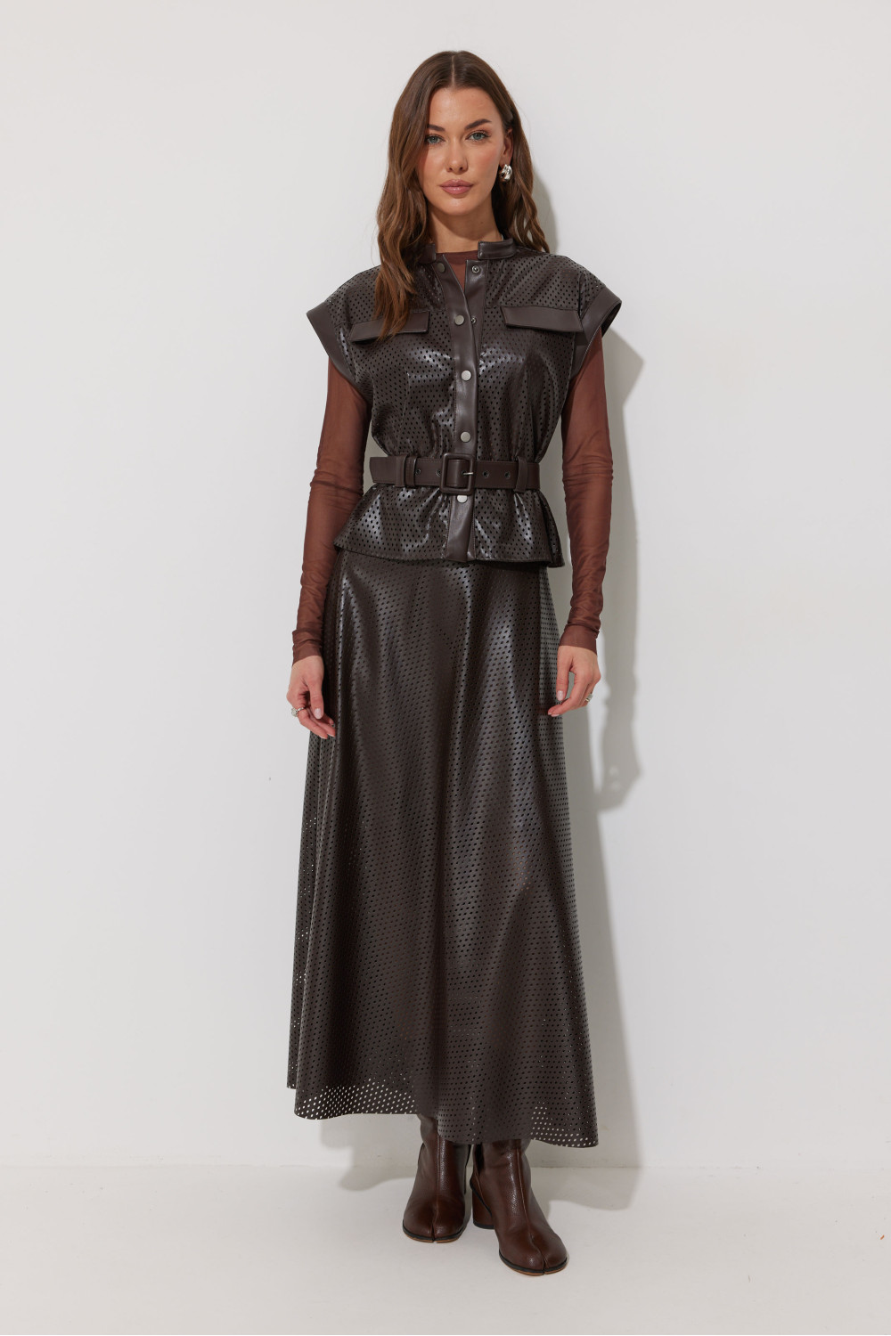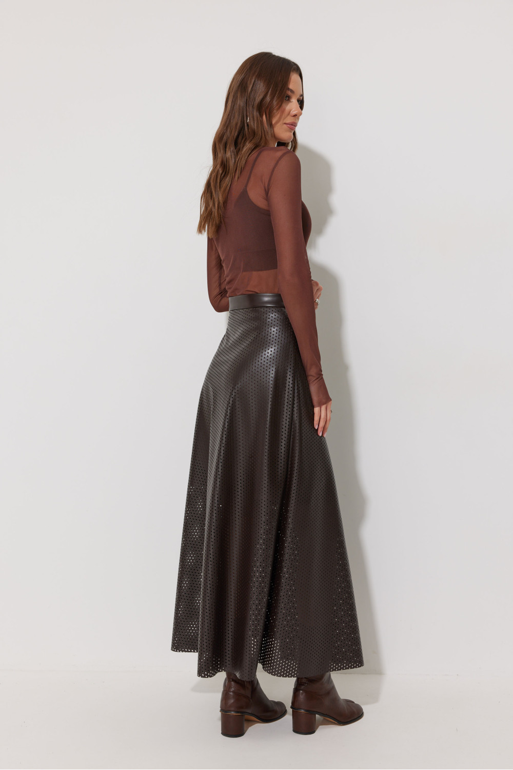 Юбка двухшовная расширенная книзу из экокожи с перфорацией. По верху юбки притачной пояс, на спинке застежка на потайную молнию.