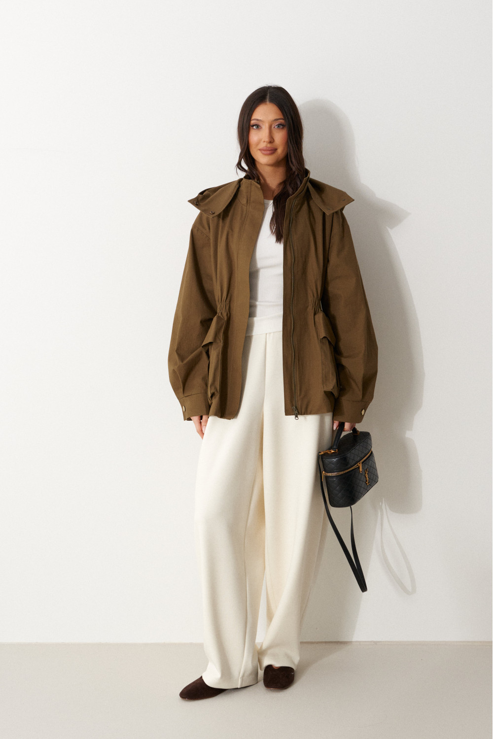 Куртка свободного кроя. Выполнена плотной хлопковой ткани коричневого цвета. С подкладкой. Воротник стойка. Застёжка центральная молния. Объёмный капюшон с застёжкой кнопками. Рукав втачной, спущенный, с манжетом, с кнопкой. Линия талии в изделии на резинке (не регулируемой). По переду внизу накладные карманы с клапаном.