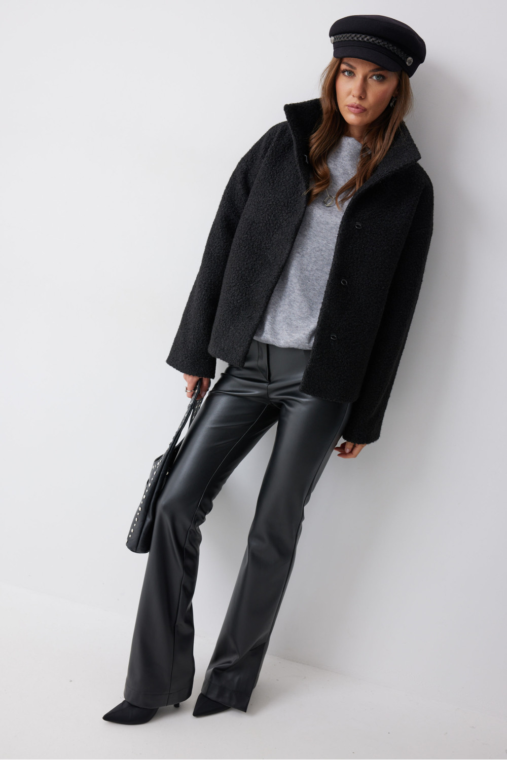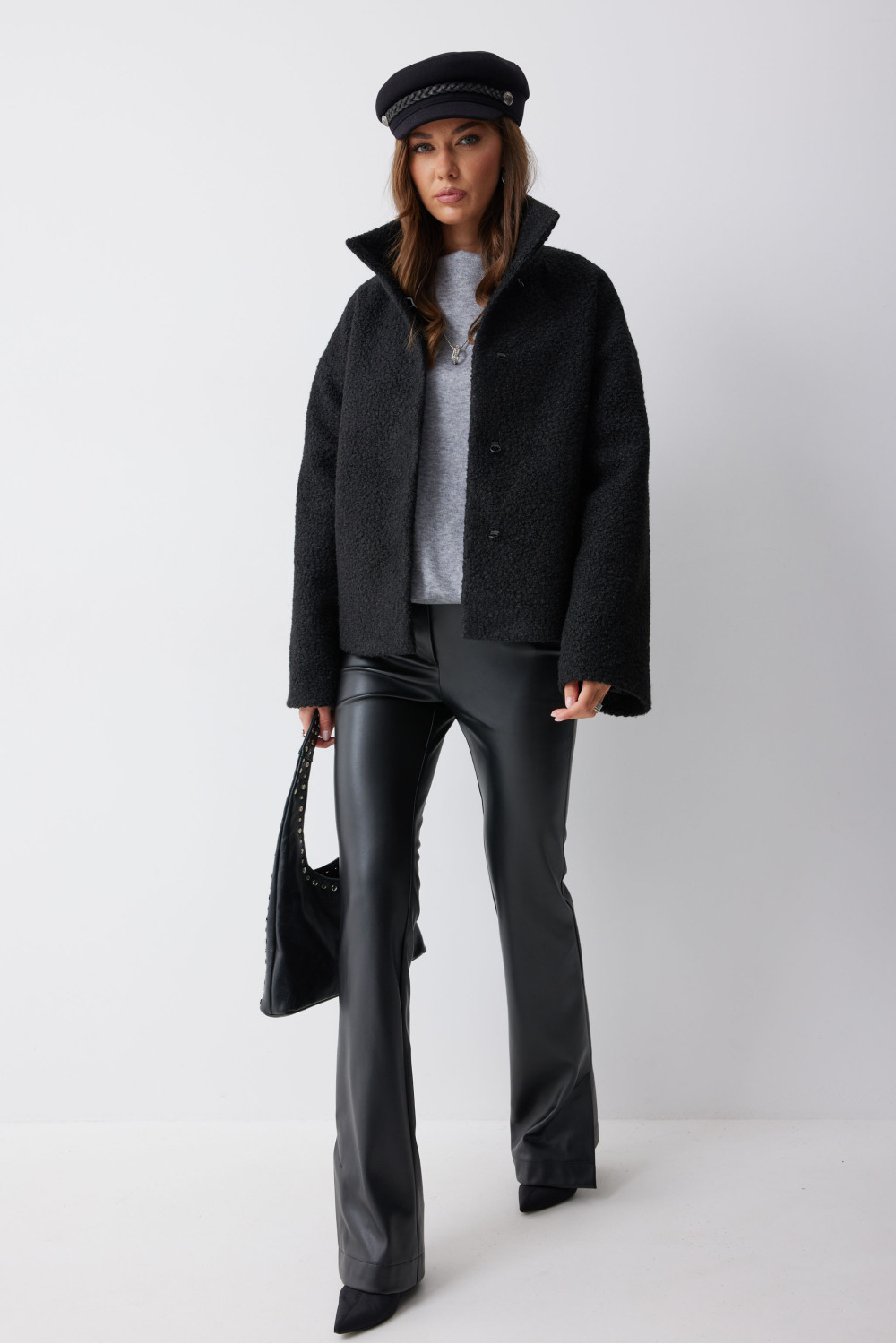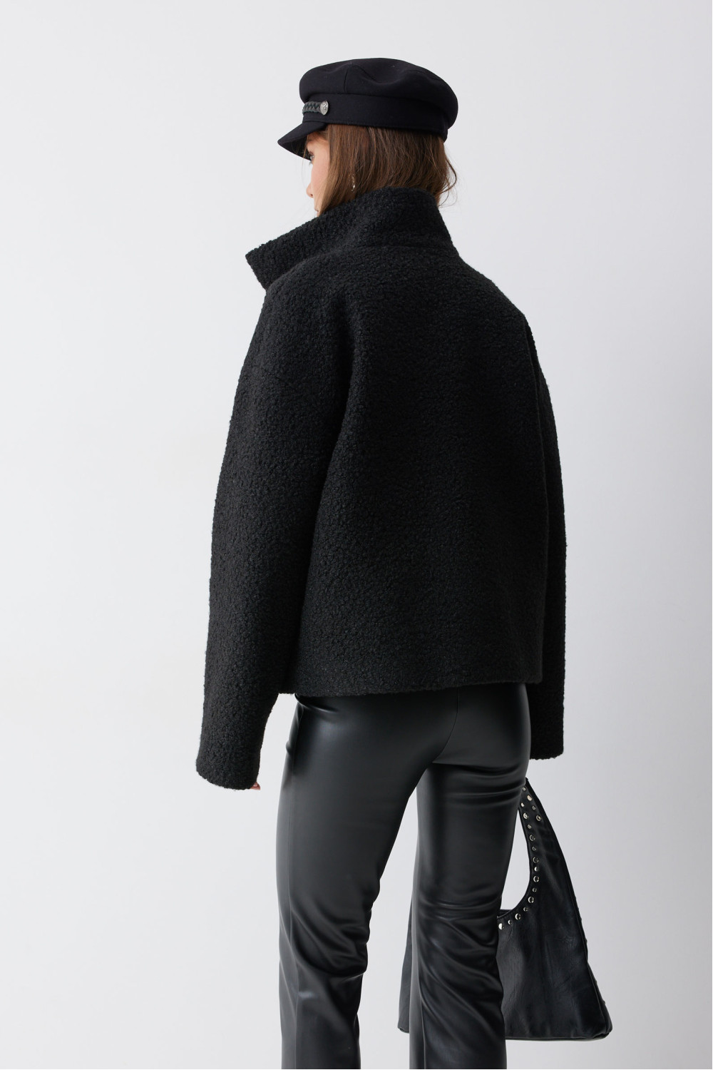 Жакет прямого силуэта из букле на трикотажной основе. Воротник-стойка. Центральная застежка на крючки. Рукав со спущенной линией плеча. По переду прорезные карманы. Жакет на подкладке. Обращаем ваше внимание, что фурнитура может отличаться от фото.