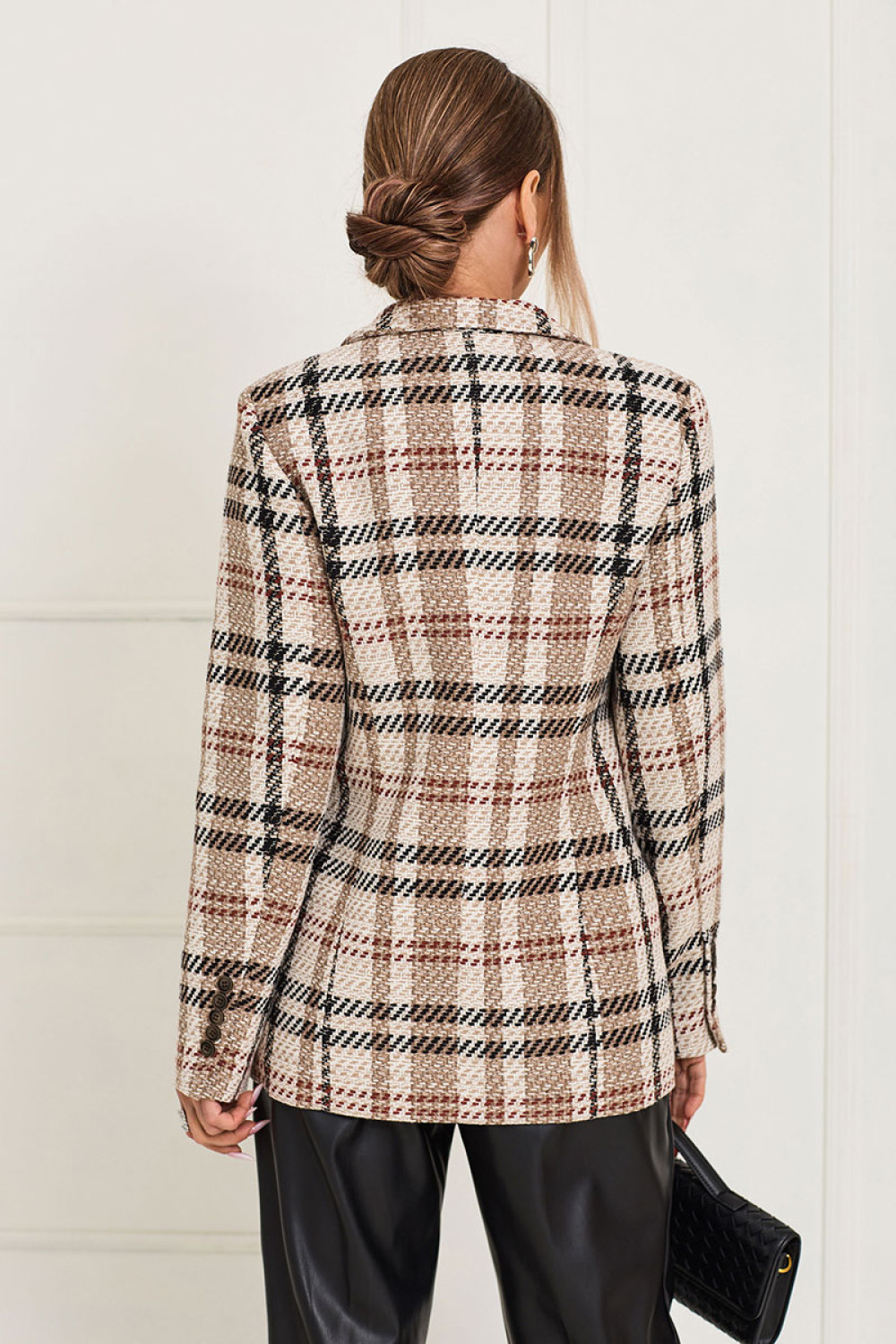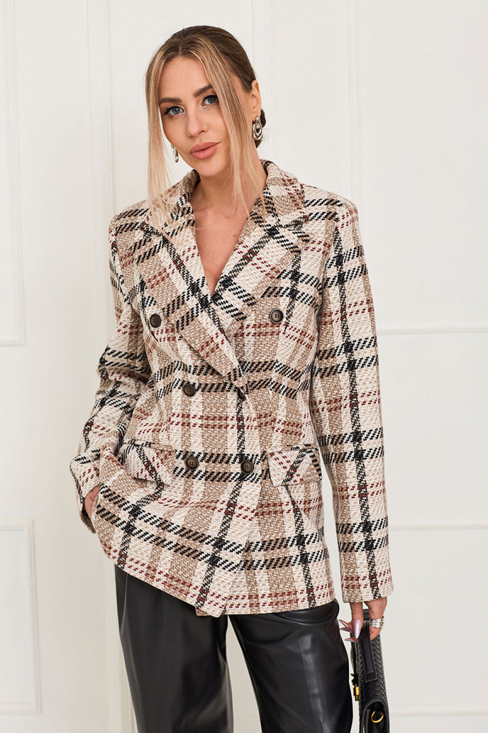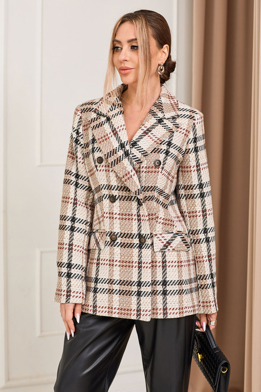 Жакет с центральной двубортной застежкой на петли и пуговицы, втачным воротником и отложными лацканами пиджачного типа. На полочках расположены прорезные карманы с клапаном и двумя обтачками. Полочки с рельефами, выходящими из проймы, талиевой вытачкой. Спинка со средним швом, рельефами, выходящими из проймы. Рукав втачной, длинный, двухшовный. Силуэт: полуприлегающий. Комплектация: жакет на подкладке.