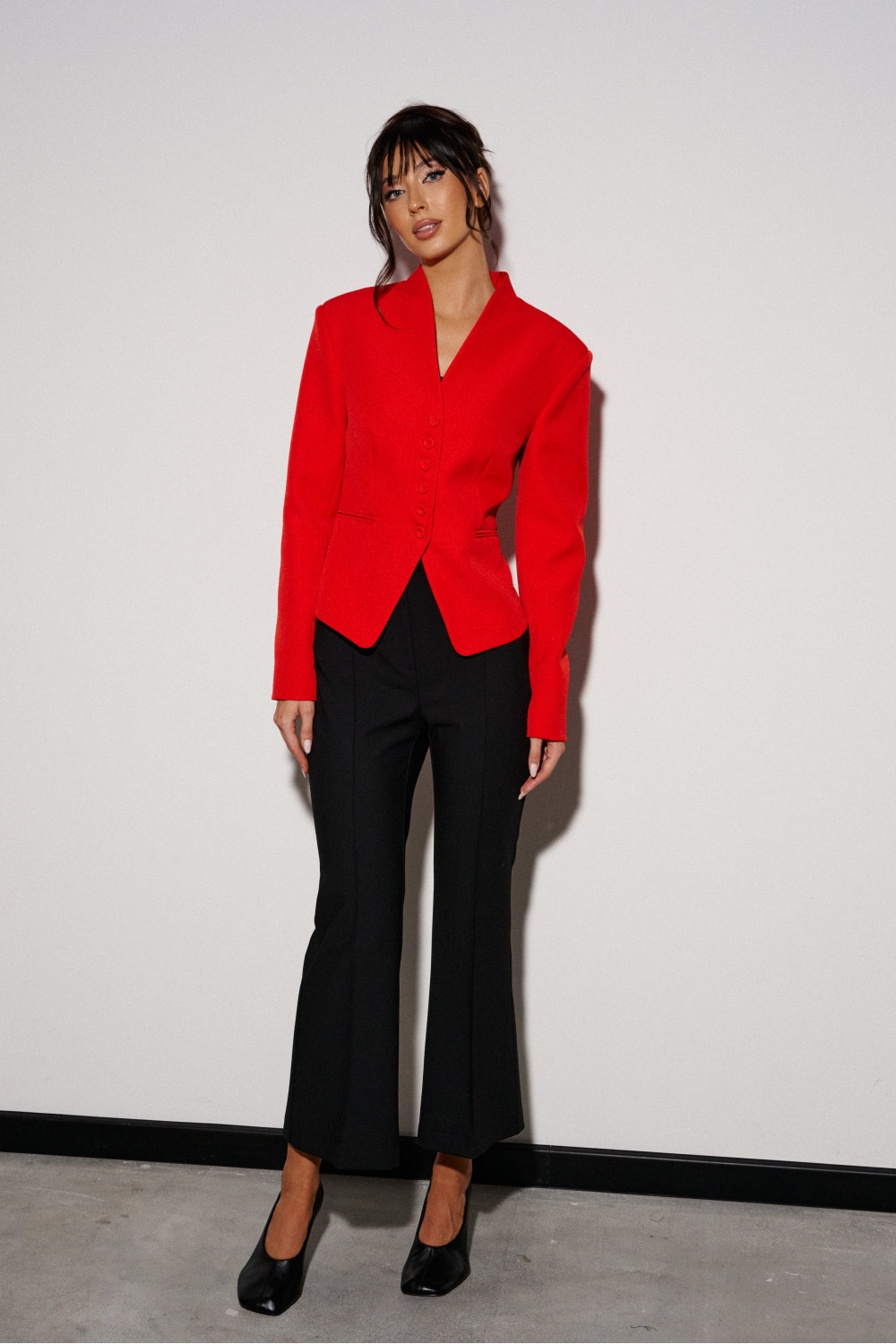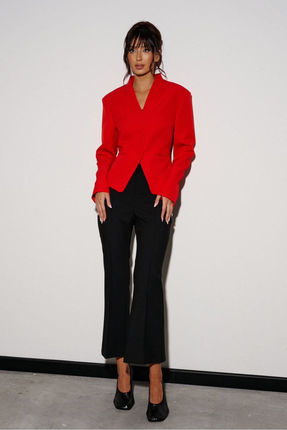 Жакет прилегающего силуэта. Выполнен из костюмной ткани красного цвета. С подкладкой. Воротник-стойка. Вырез горловины V-образный. Рукав втачной. По переду прорезные карманы. Застёжка центральная - пуговицы. Низ жакета фигурный.