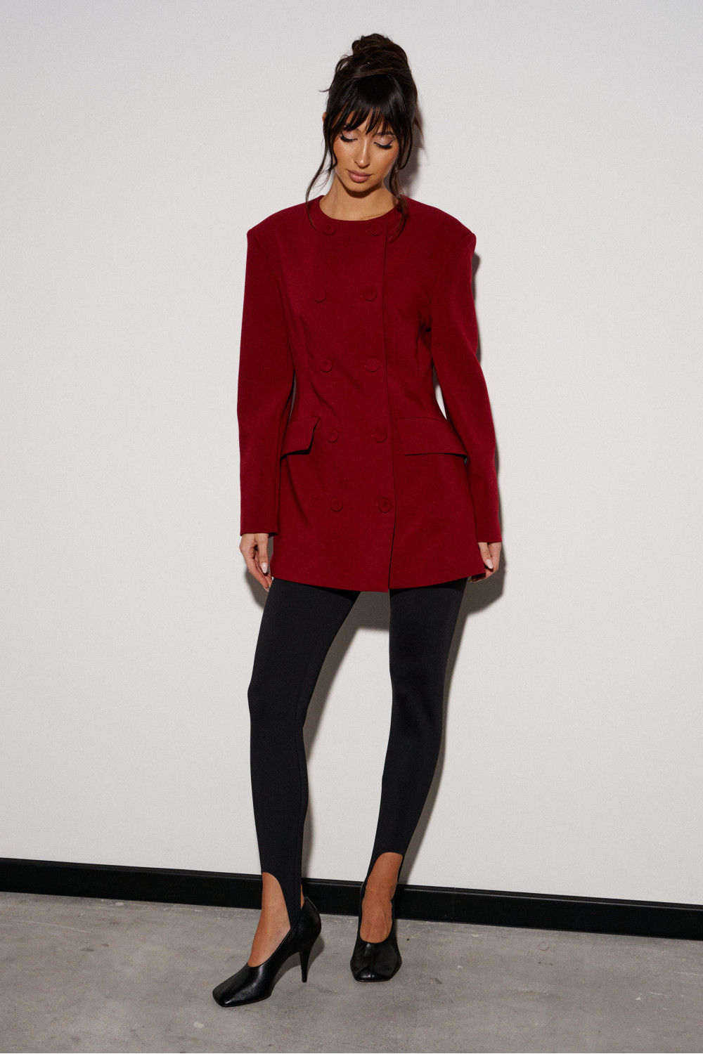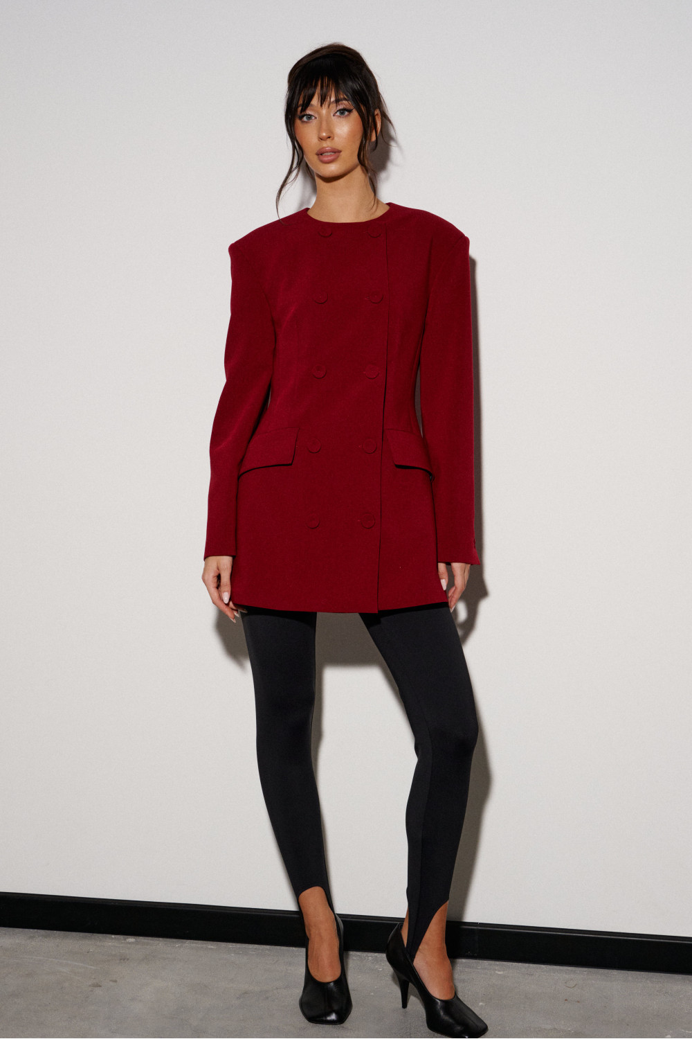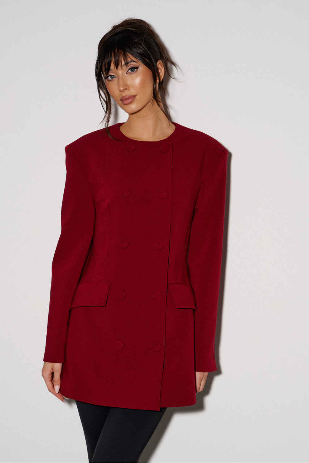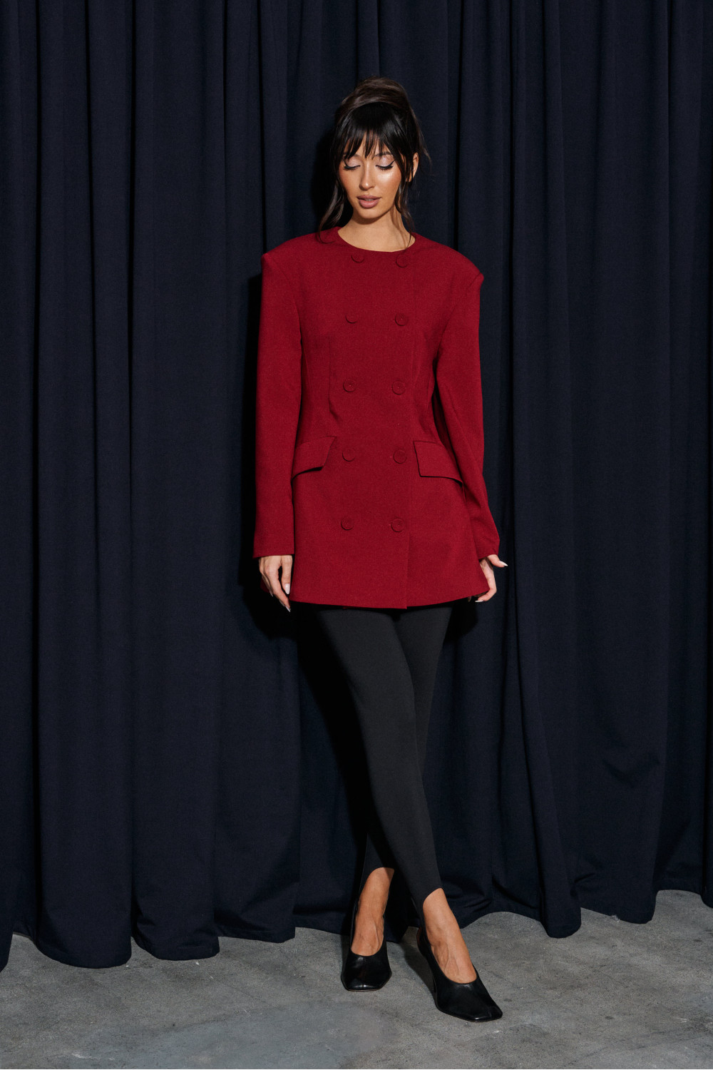 Жакет полуприталенного силуэта выполнен из костюмной ткани бордового цвета. Характеристики: полуприталенный силуэт, двубортный, брендированная подкладка, подплечники, овальный вырез горловины, по переду функциональные карманы с клапаном, рукав втачной, по низу рукава нашиты пуговички.