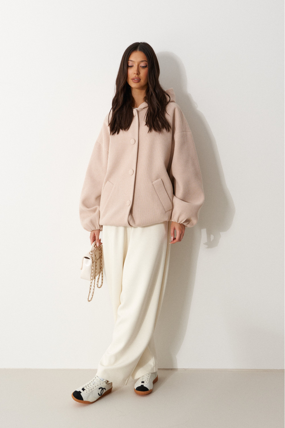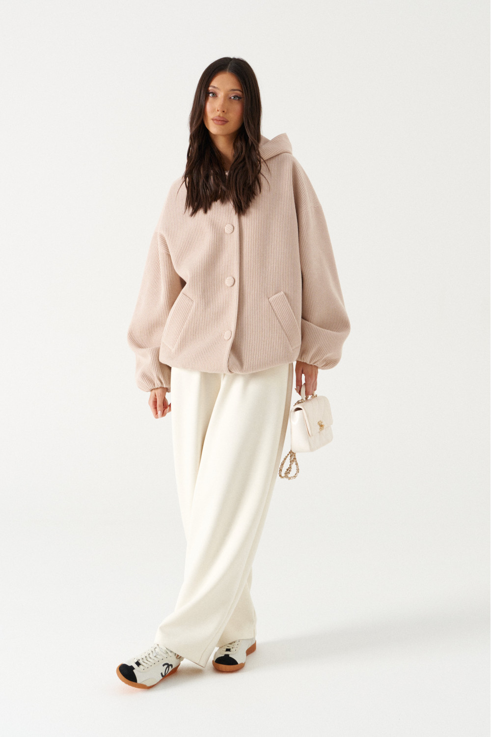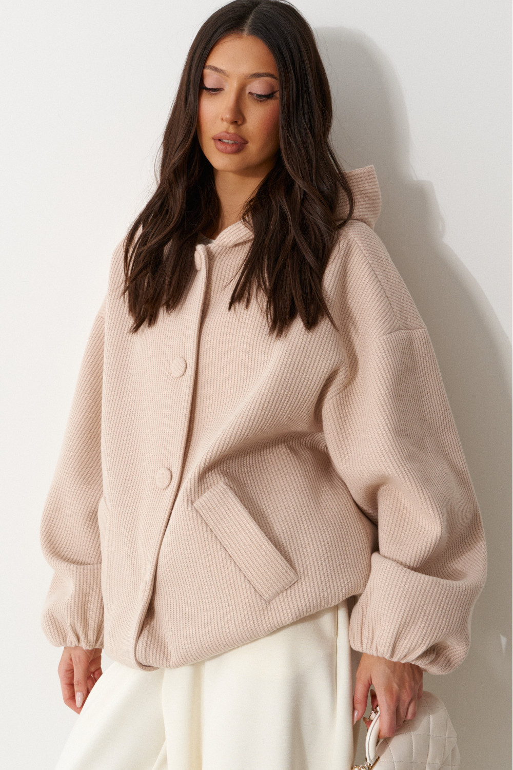 Жакет (бомбер), прямого силуэта , на подкладке. Выполнен из фактурной пальтовой ткани бежевого цвета. Характеристика: горловина круглая с притачным капюшеном. Линия плеча спущенная. Рукав длинный, одношовный, втачной. По низу присборен на резинку. По деталям полочки прорезные карманы с накладными листочками. Спинка цельная. Застежка центральная бортовая, застегивающаяся на прорезные петли и пришивные пуговицы.