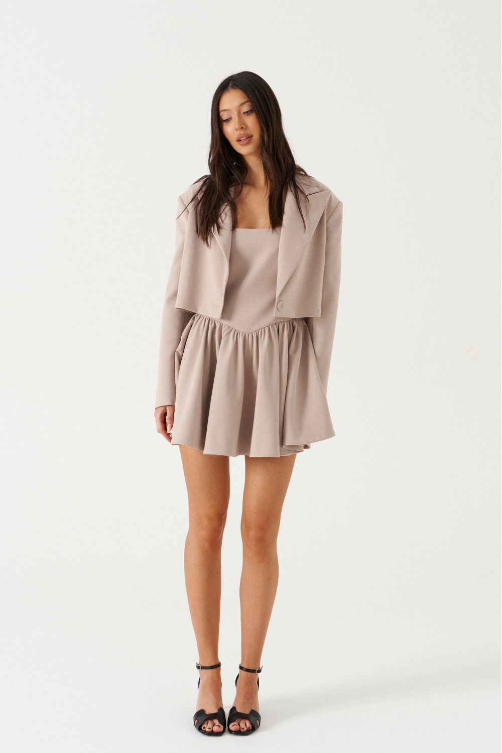 Жакет выполнен из костюмной ткани бежевого цвета. Характеристика: укороченный жакет, отложной воротник с острым лацканам, центральная застежка на петлю-пуговицу, брендированный подклад, рукав втачной, чуть спущенный, подплечники, на манжете три пуговицы.