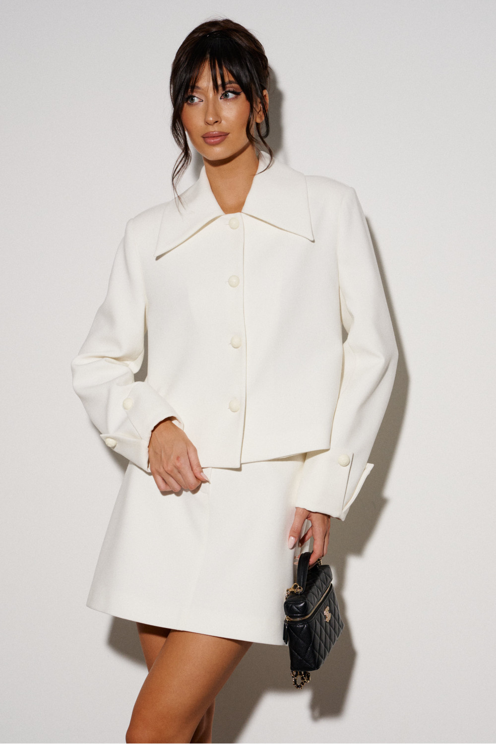 Жакет прямого кроя, выполнен из костюмной ткани белого цвета. Характеристики: прямой силуэт, отложной воротник, застёжка центральная - пуговицы, втачной рукав, по низу рукава манжета на отворот с пуговицами, на подкладке. Длина рукава от линии втачивания 60 см, длина изделия по спинке 50 см.