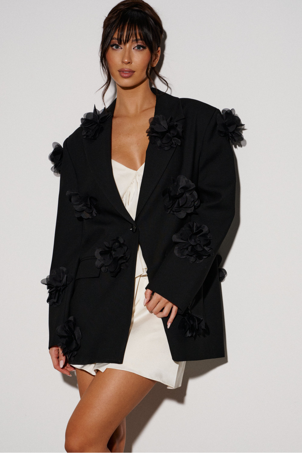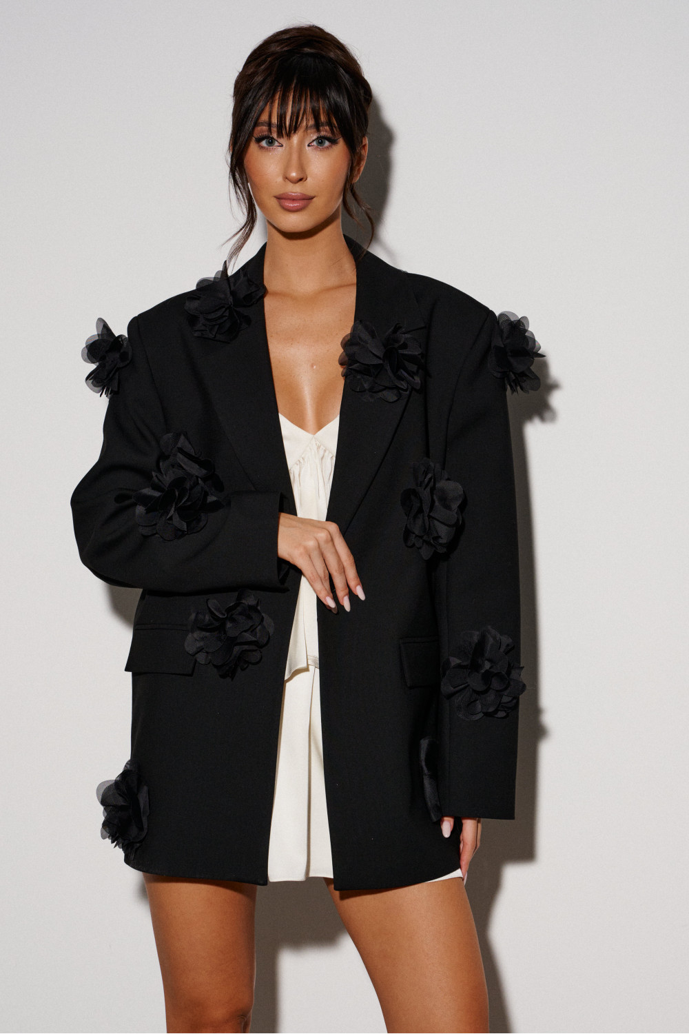 Жакет прямого свободного кроя выполнен из костюмной ткани черного цвета, декорирован несъемными цветами из шифона . Характеристики: прямой свободный крой, брендированная подкладка, подплечники, воротник с остроугольным лацканом, застежка центральная на петлю - пуговицу, по переду функциональные карманы с клапаном, рукав втачной, по низу рукава нашиты пуговички, спинка со средним швом, в среднем шве разрез 24 см.