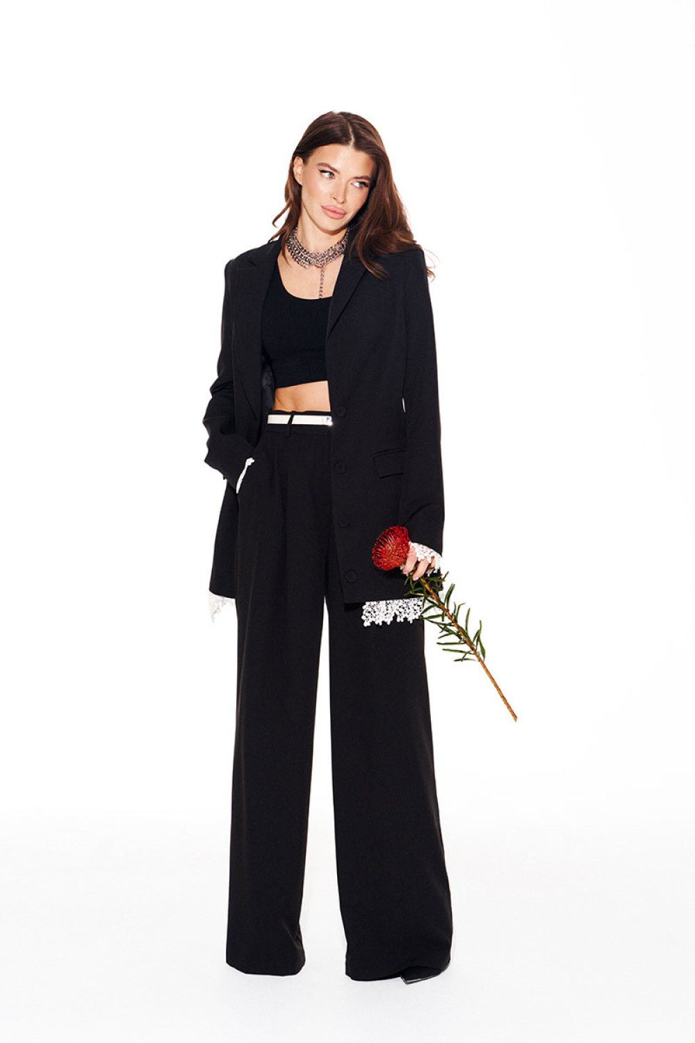 Жакет умеренного объема, полуприлегающего силуэта, с отложным воротником и лацканами пиджачного типа, центральной застежкой на петли и пуговицы, на подкладке. Детали переда с талиевыми вытачками, отрезными бочками, прорезными карманами с клапанами и двумя обтачками. Спинка со средним швом и отрезными бочками. Рукав втачной, двухшовный, длинный. Низ жакета и рукавов оформлен съемной тесьмой из кружева.
