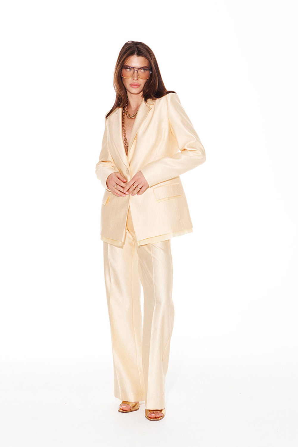Жакет из костюмно-плательной ткани, умеренного объема, прямого силуэта, с центральной застежкой на 1 петлю и 1 пуговицу, отложным воротником и лацканами пиджажного типа, на подкладке. Детали переда с талиевыми вытачками, отрезными бочками и прорезными карманами с клапанами и двумя обтачками. Спинка со средним швом и отрезными бочками. Рукав втачной, двухшовный, длинный. Клапаны и низ изделия оформлены планками из контрастной ткани.