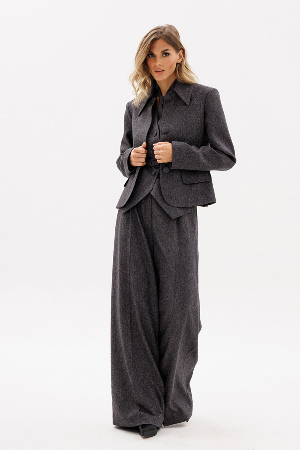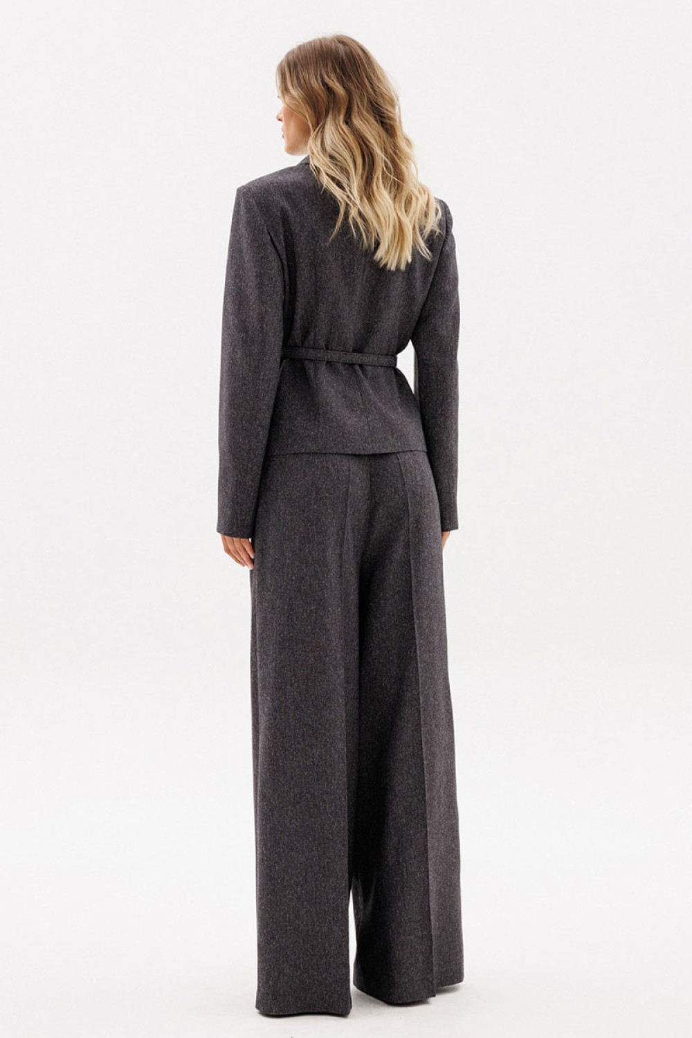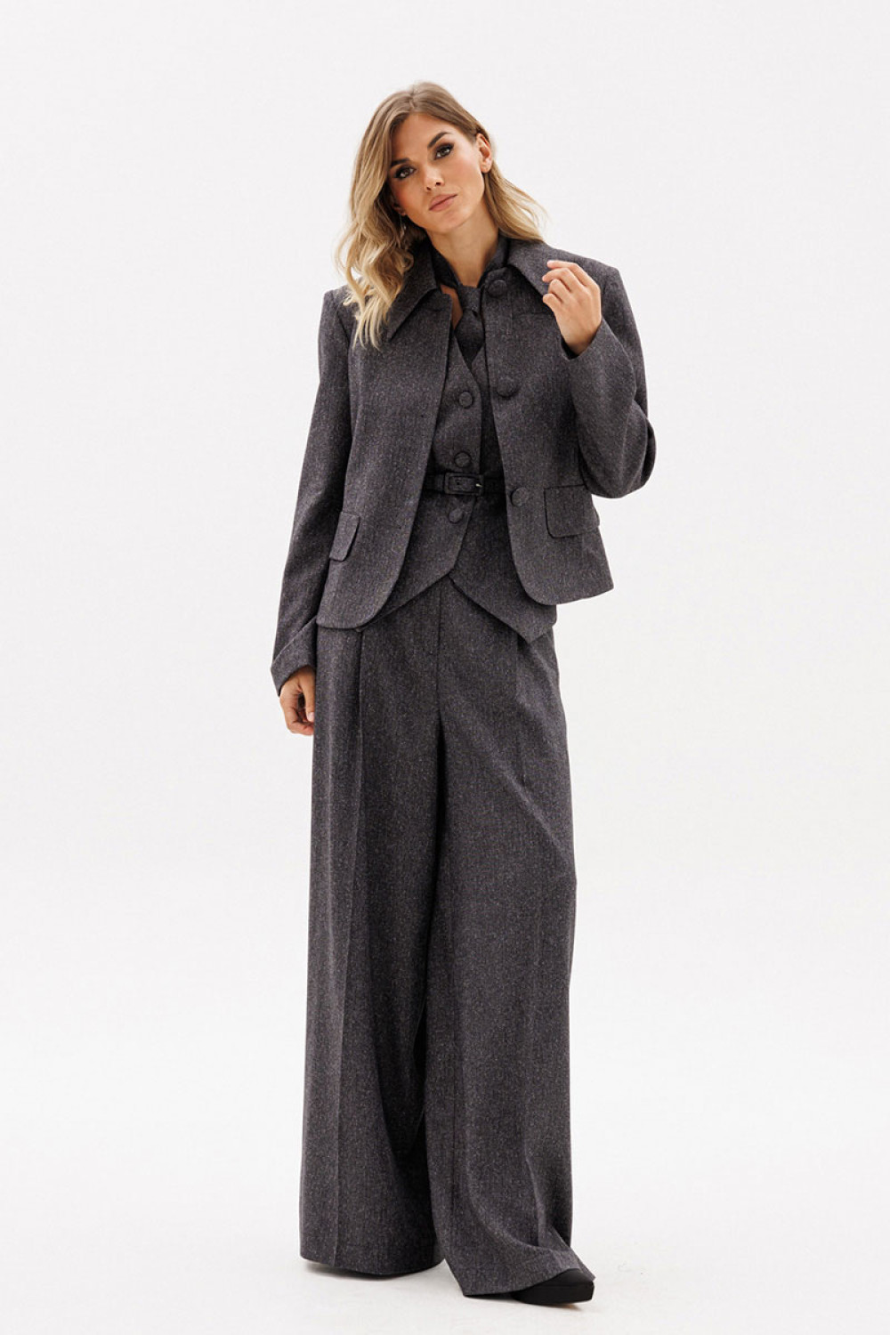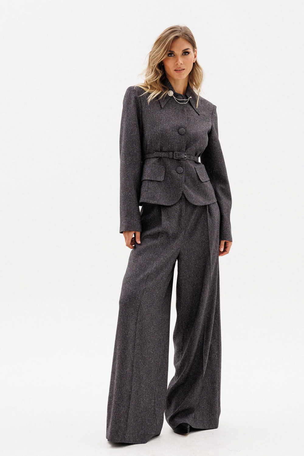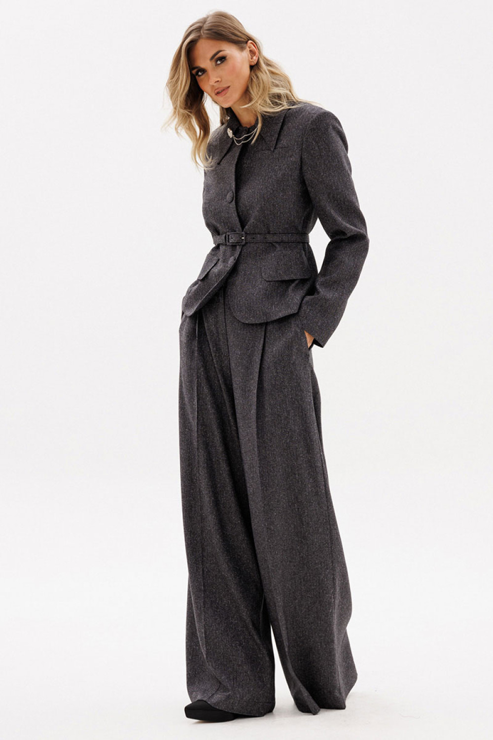 Жакет выполнен из костюмной ткани меланж. Жакет полуприлегающего силуэта длиной выше линии бедер. Спереди центральная застежка на пуговицы и декоративные клапаны. Воротник стояче-отложной. Спинка со средним швом. Рукав втачного покроя двухшовный. Жакет на притачной по низу подкладке. В комплект входит ремень из основной ткани с обтяжной пряжкой.