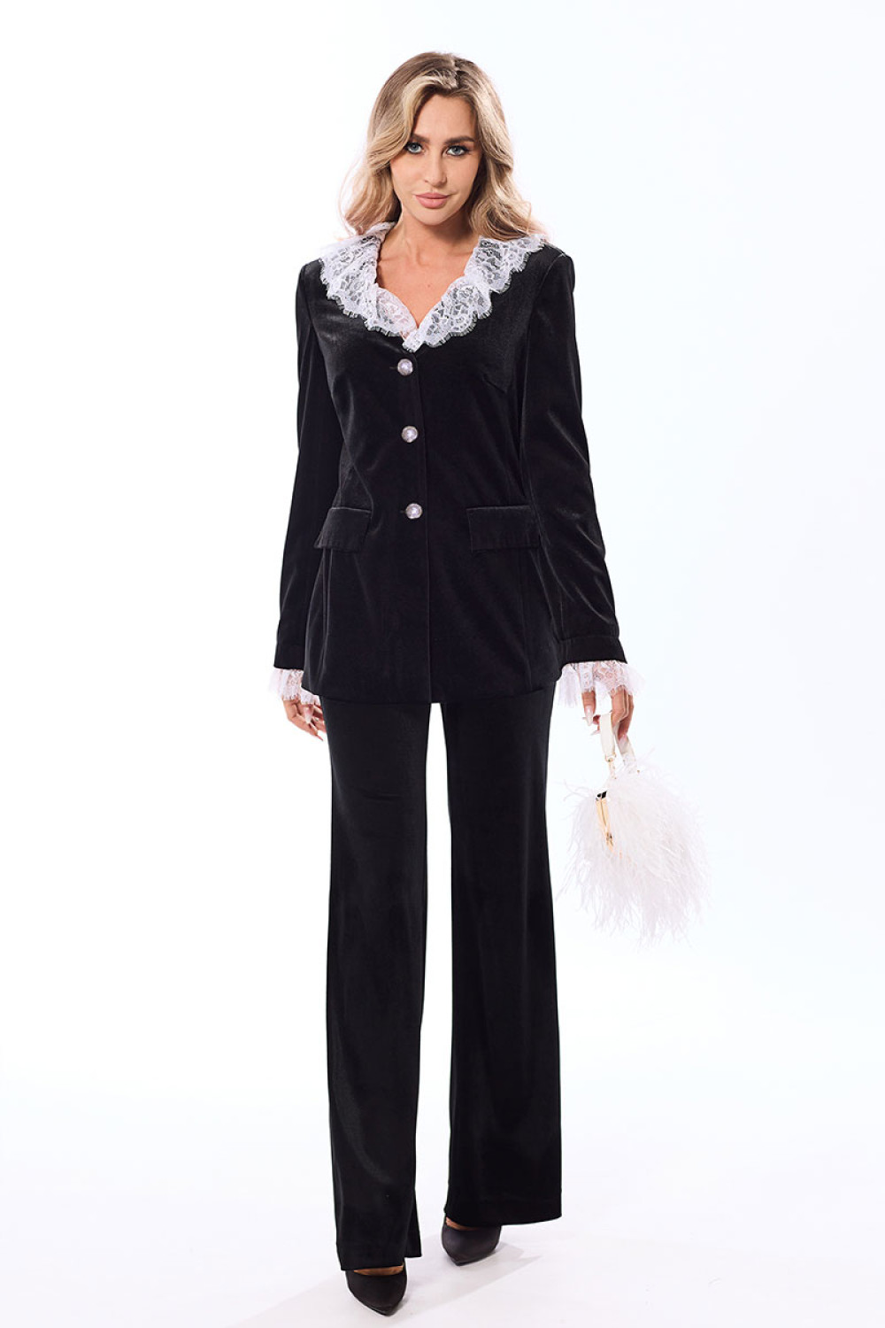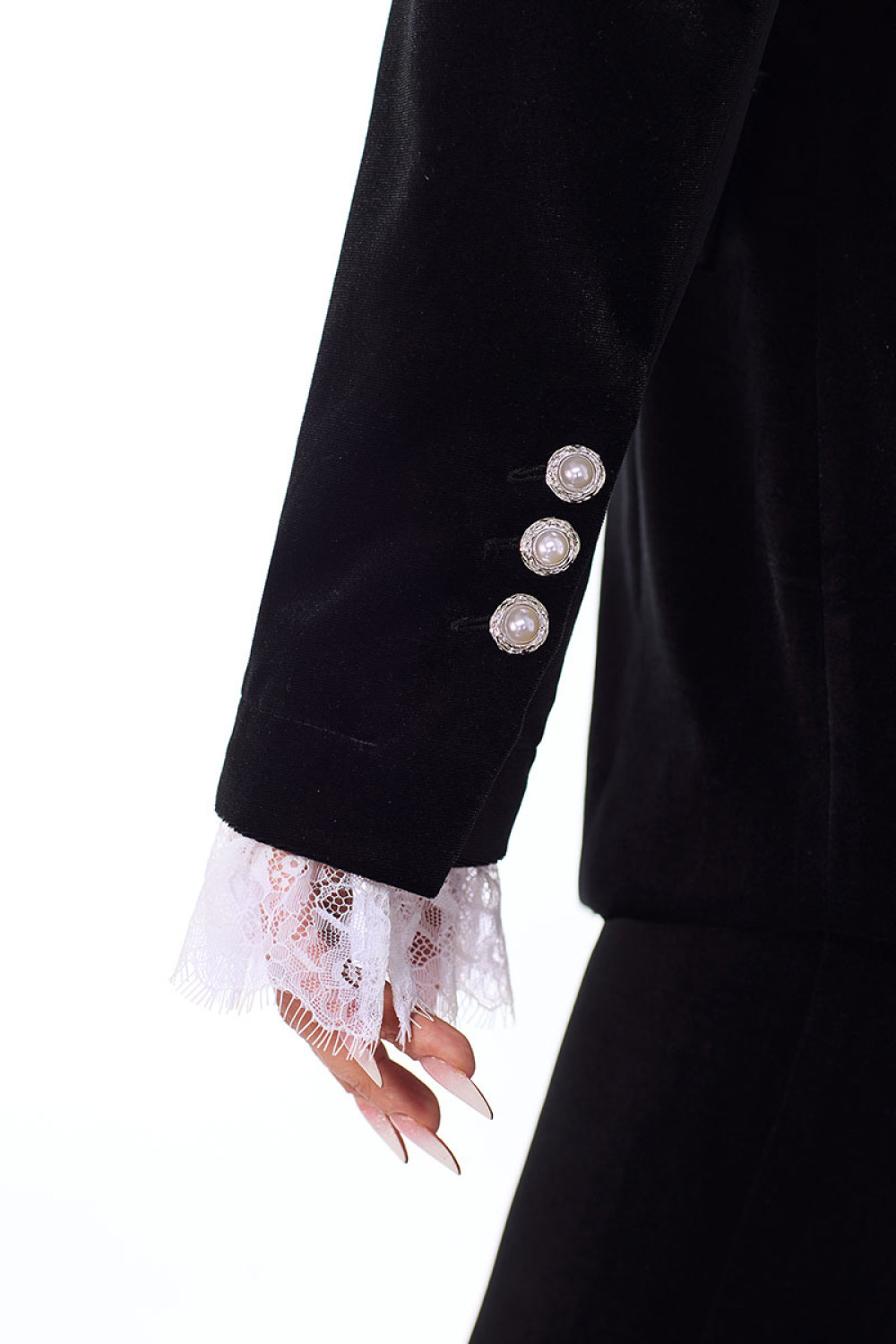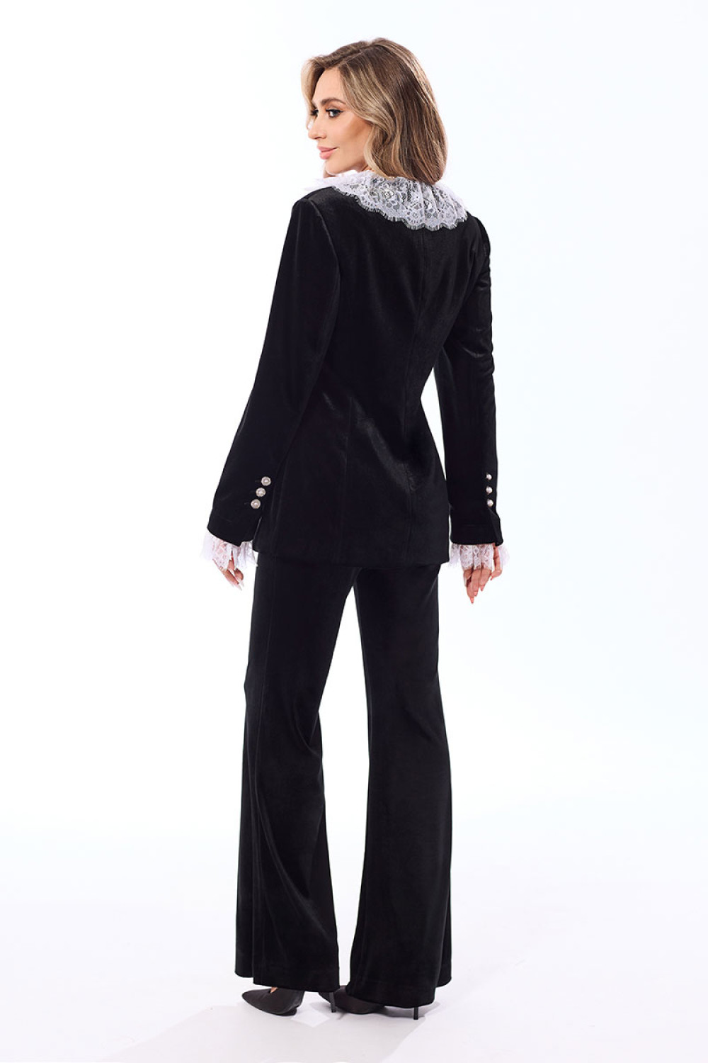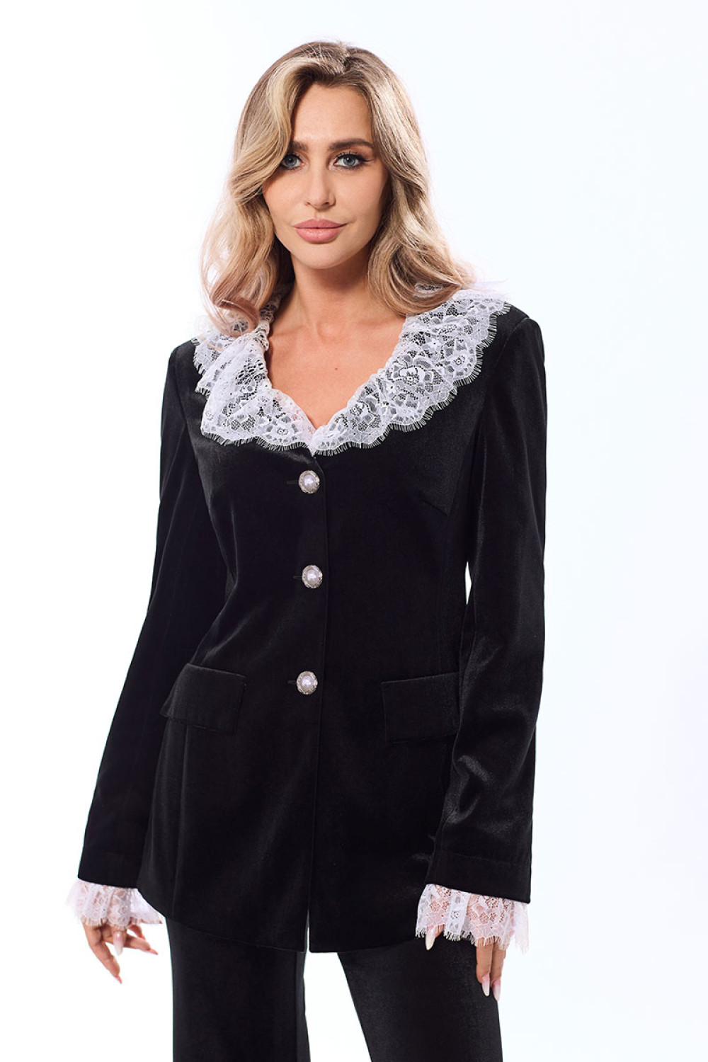 Жакет с центральной застежкой на петли и пуговицы, со съемным кружевным воротником, V-образным вырезом горловины. По переду с рельефами, выходящими из проймы, талиевыми вытачками. На уровне линии бедер расположены настрочные клапаны . Спинка со средним швом, рельефами, выходящими из проймы. Рукав втачной, длинный, с открытой шлицей и съемными кружевными манжетами. Силуэт: прямой.