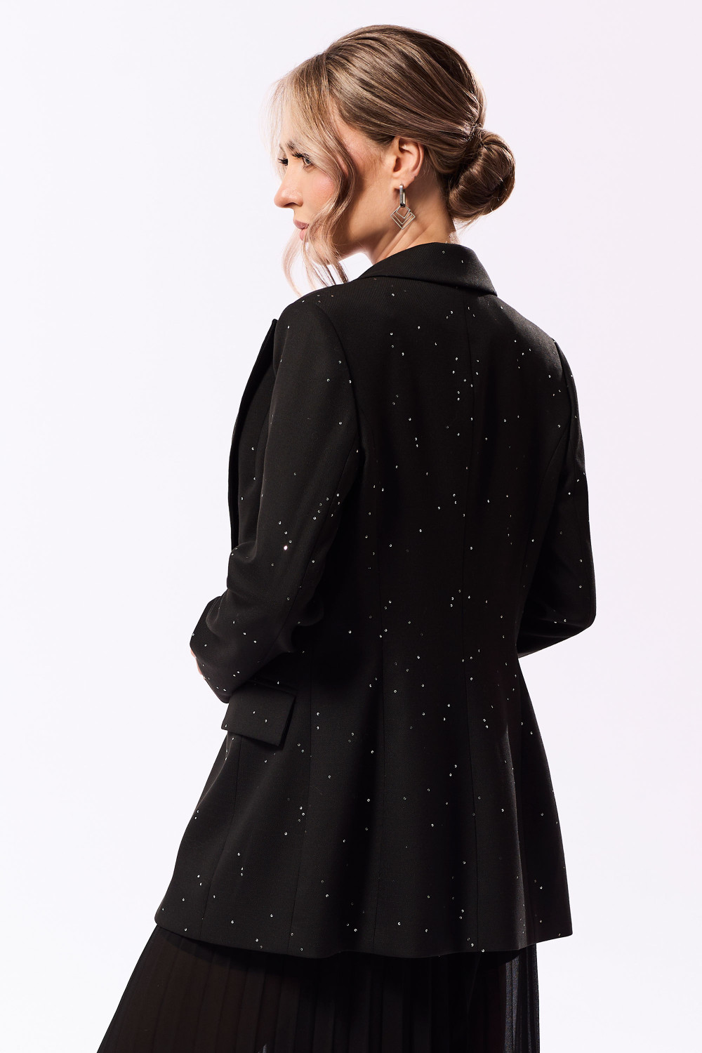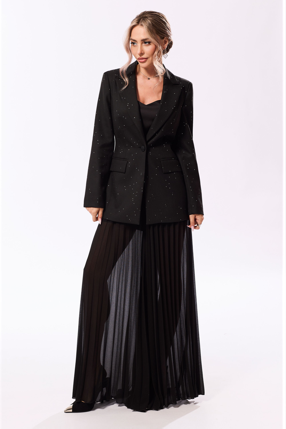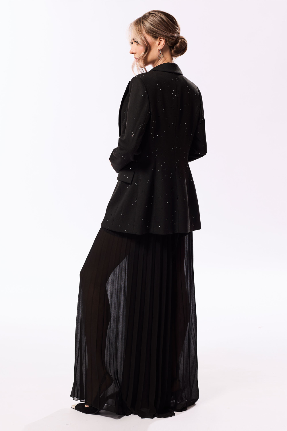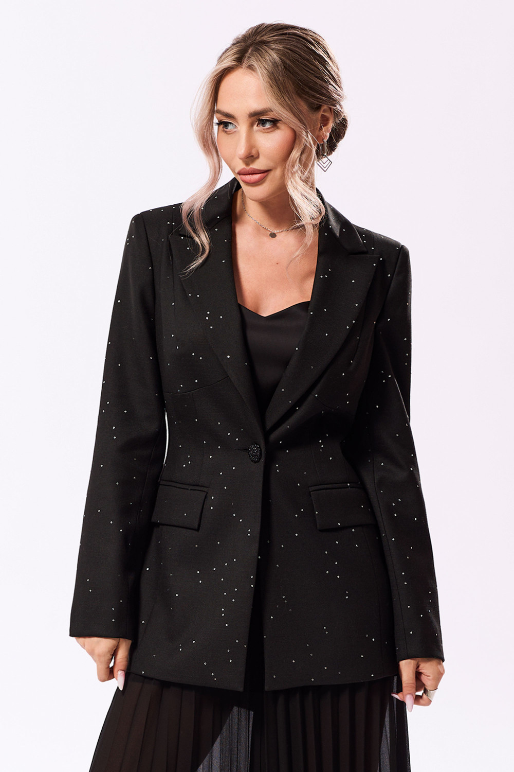 Жакет с центральной застежкой на петли и пуговицы, без воротника, с втачным воротником и отложными лацканами пиджачного типа. По переду с фигурными подрезами, рельефами и талиевыми вытачками. По спинке со средним швом, рельефами, выходящими из проймы. Рукав втачной, длинный. Жакет выполнен из ткани в одной цветовой гамме, декорированной пайетками.