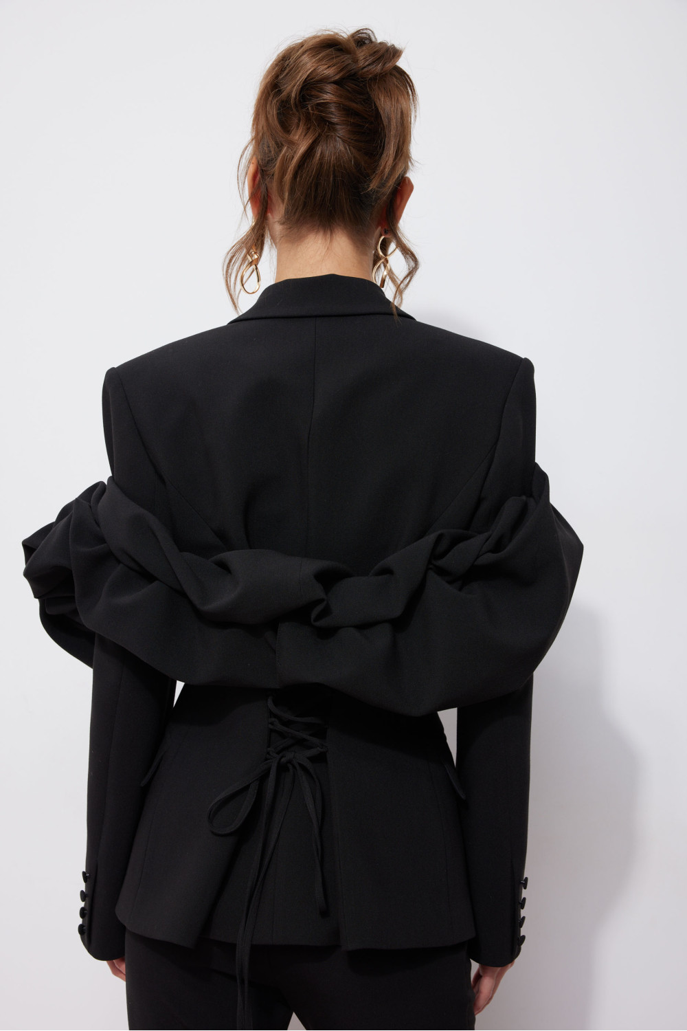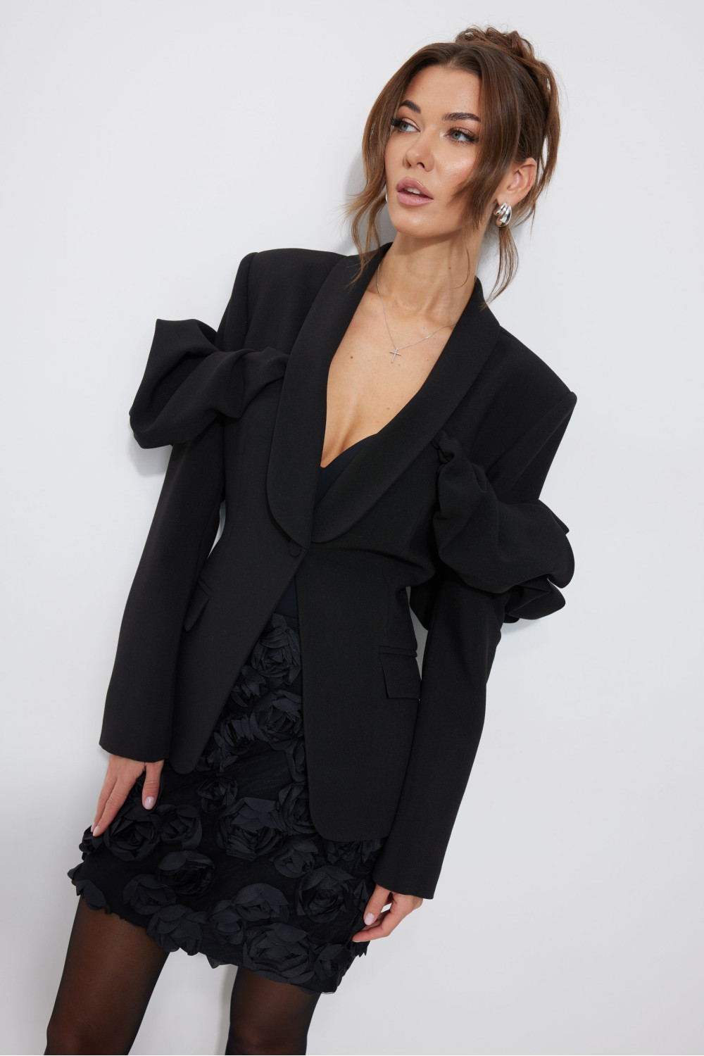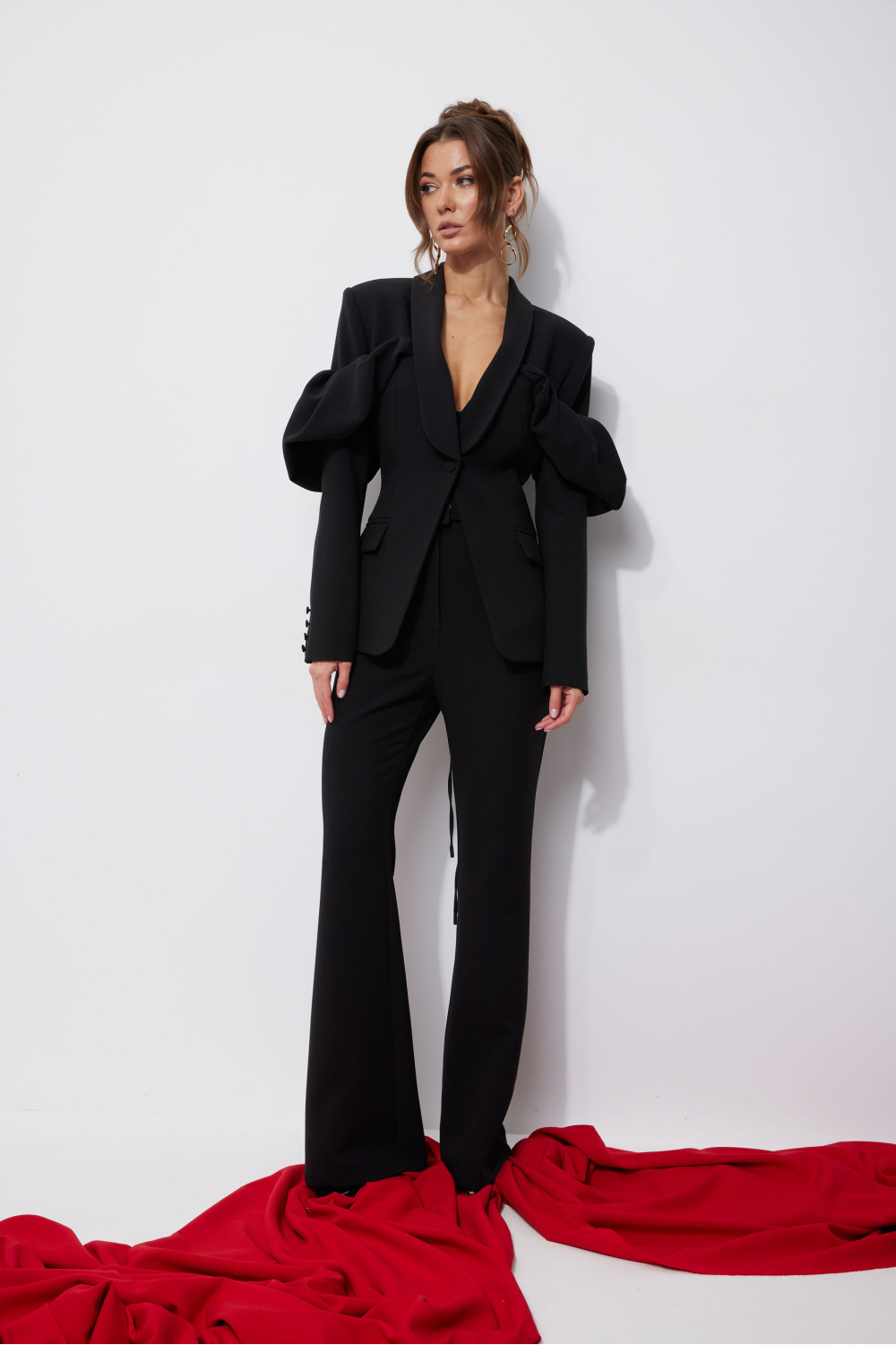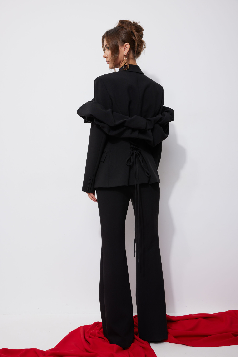 Жакет полуприлегающего силуэта из костюмной ткани. Жакет с V- образным вырезом и воротником, с застежкой по центру на петлю и пуговицу. Рукав втачной двухшовный, по низу декоративная шлица с пуговицами. По переду рельефы, талиевые вытачки и функциональные карманы с клапанами. На спинке декоративный элемент для регулирования степени прилегания изделия. В комплект входит съемная деталь. Обращаем ваше внимание, что фурнитура может отличаться от фото.