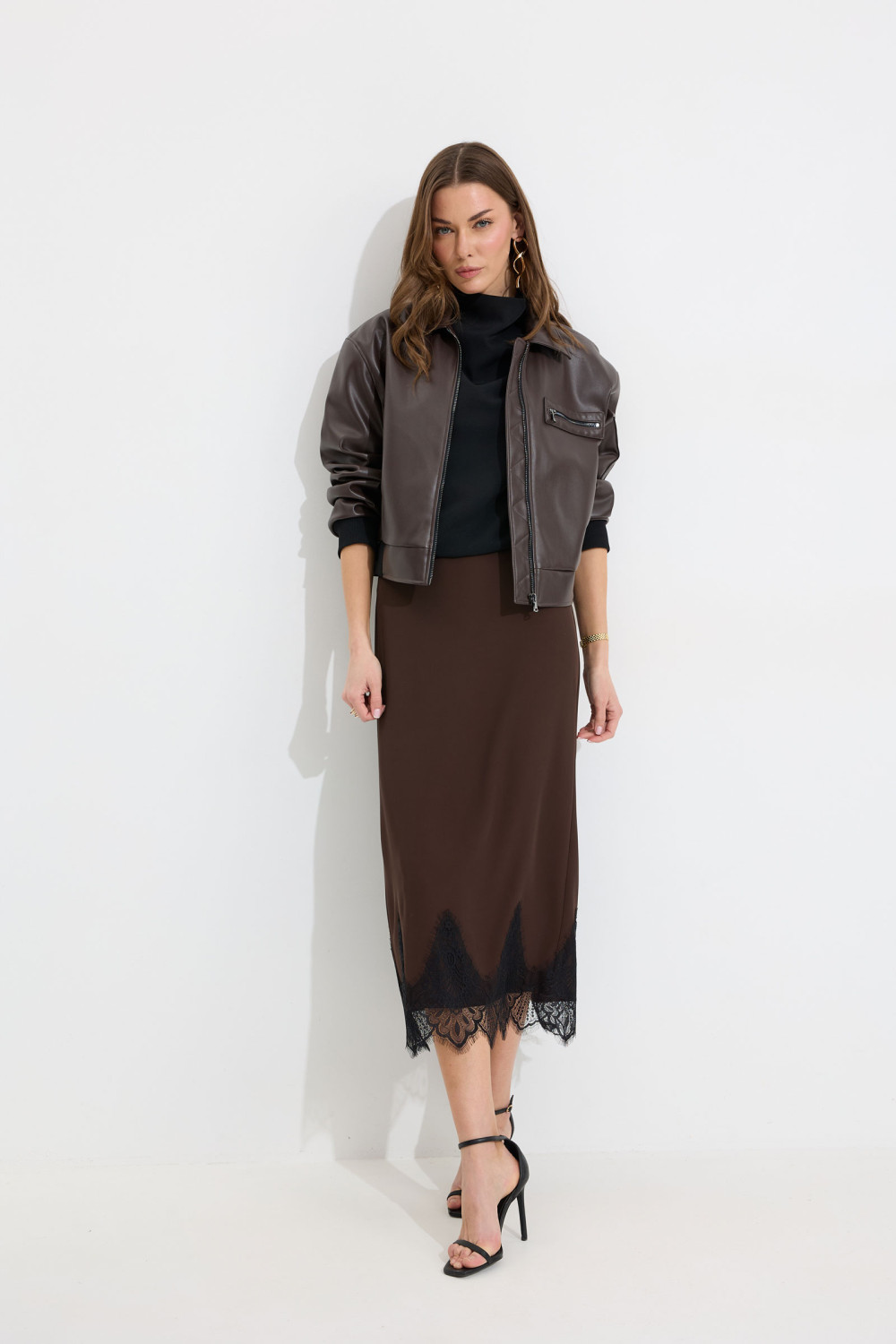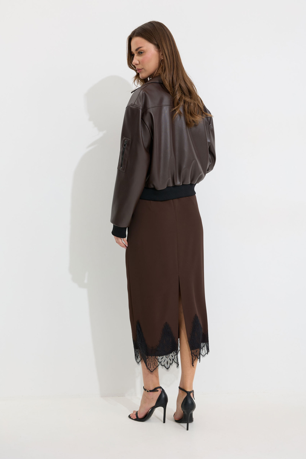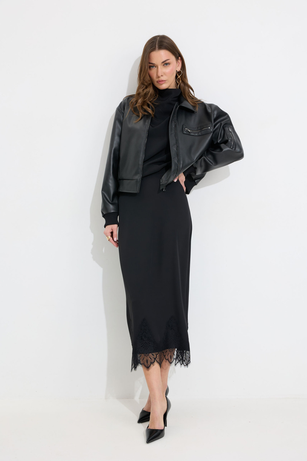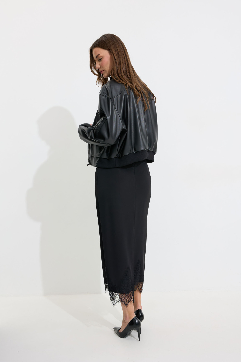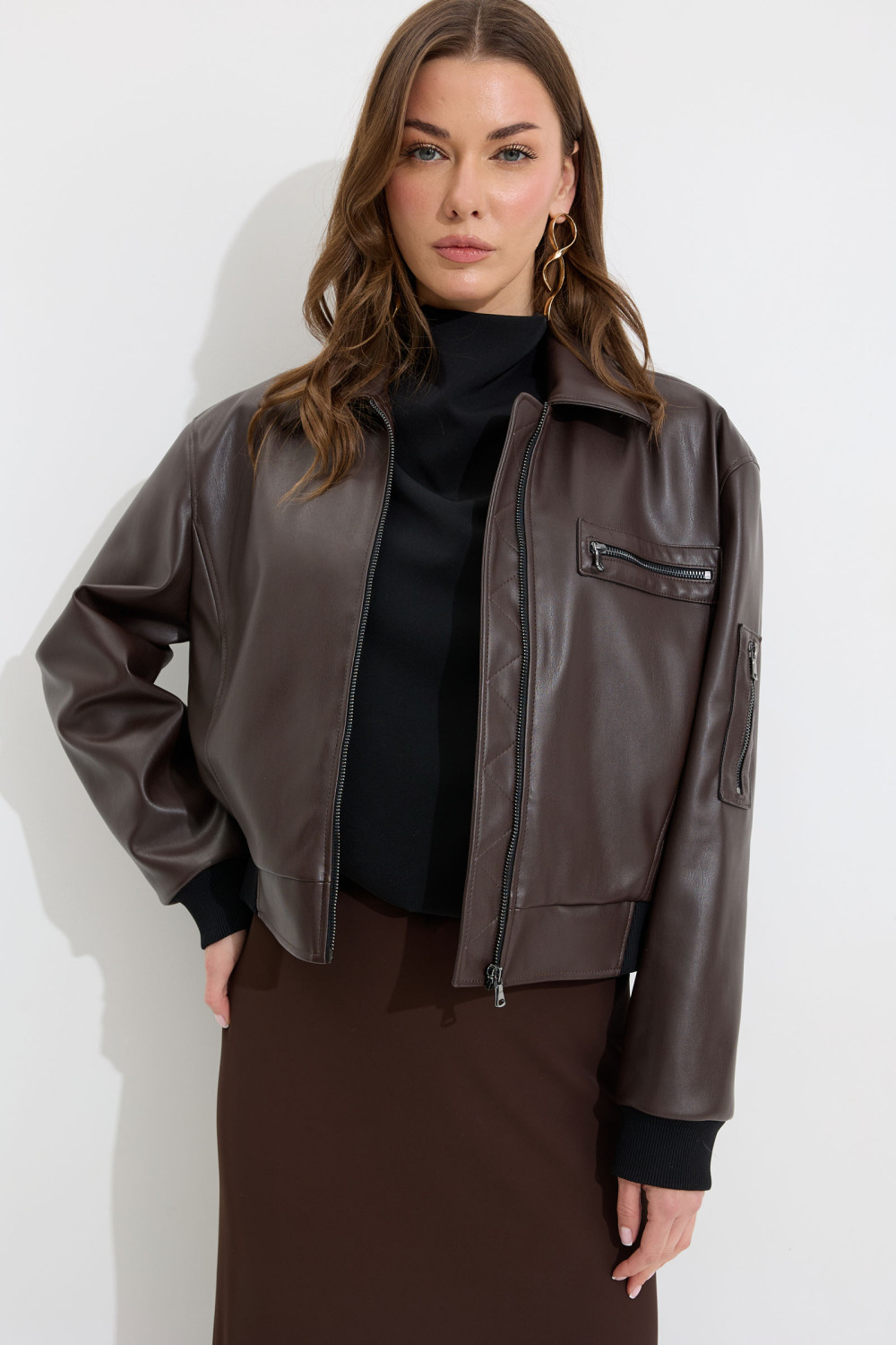Жакет прямого силуэта из экокожи. Воротник отложной, по центру застежка на молнию. Жакет с удлиненной линией плеча, рукав одношовный втачной, по низу рукава манжета (из трикотажного полотна). По переду рельефы с функциональными карманами и декоративный элемент с молнией. На спинке кокетка. По низу жакета притачной пояс (из трикотажного полотна). Жакет на подкладке. Обращаем ваше внимание, что фурнитура может отличаться от фото.
