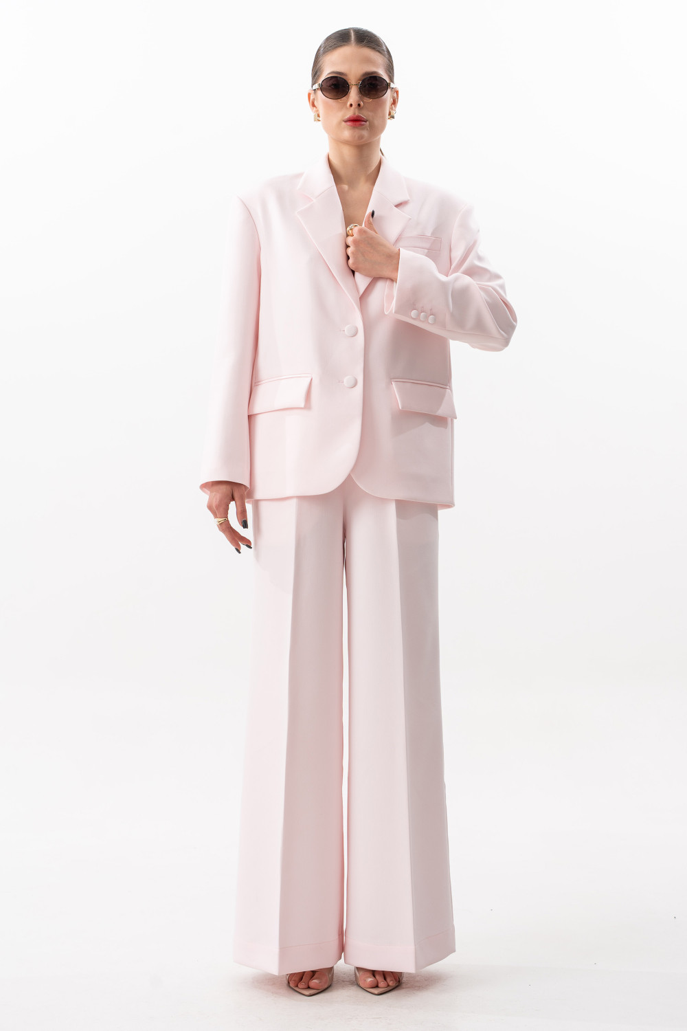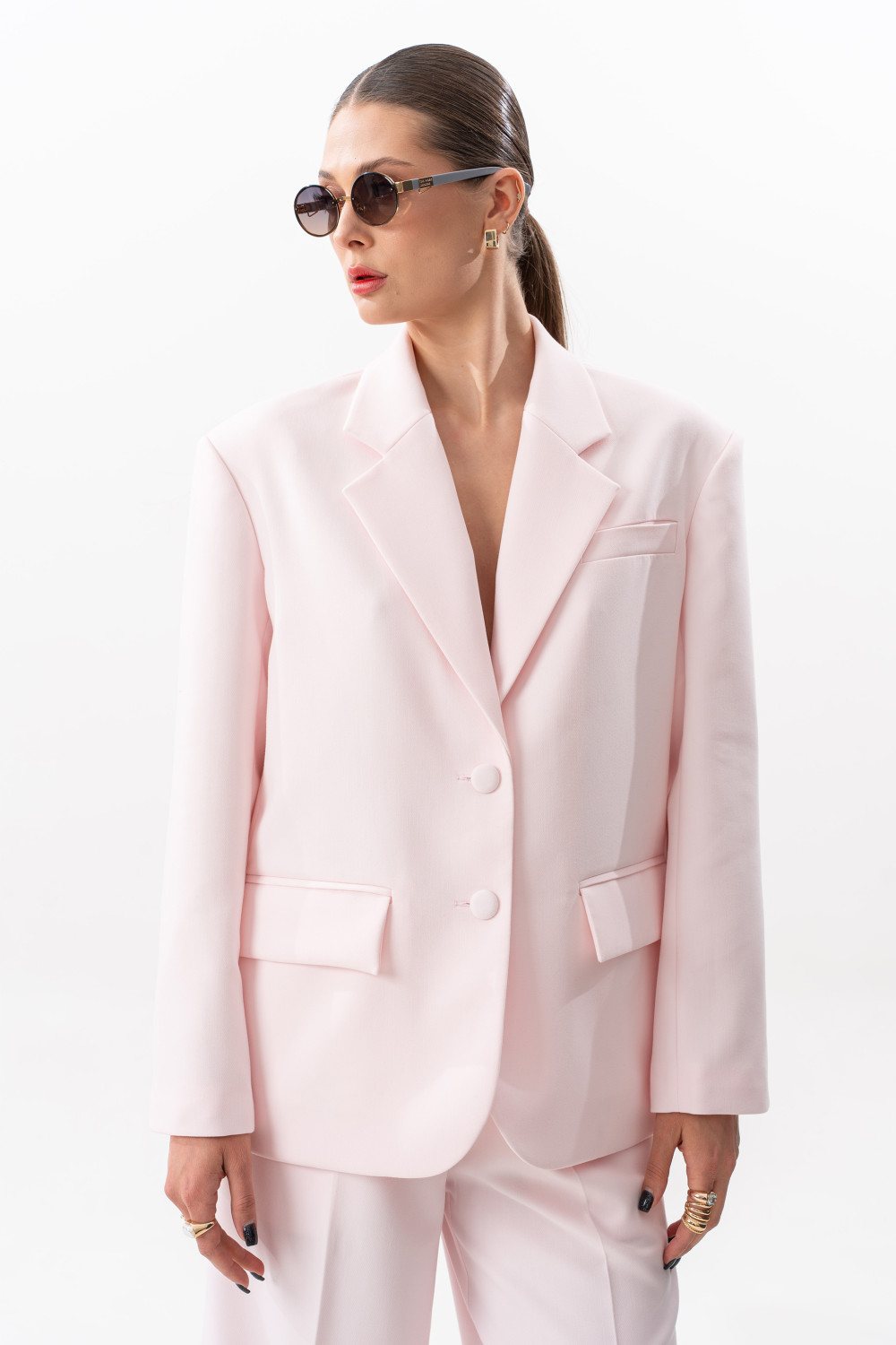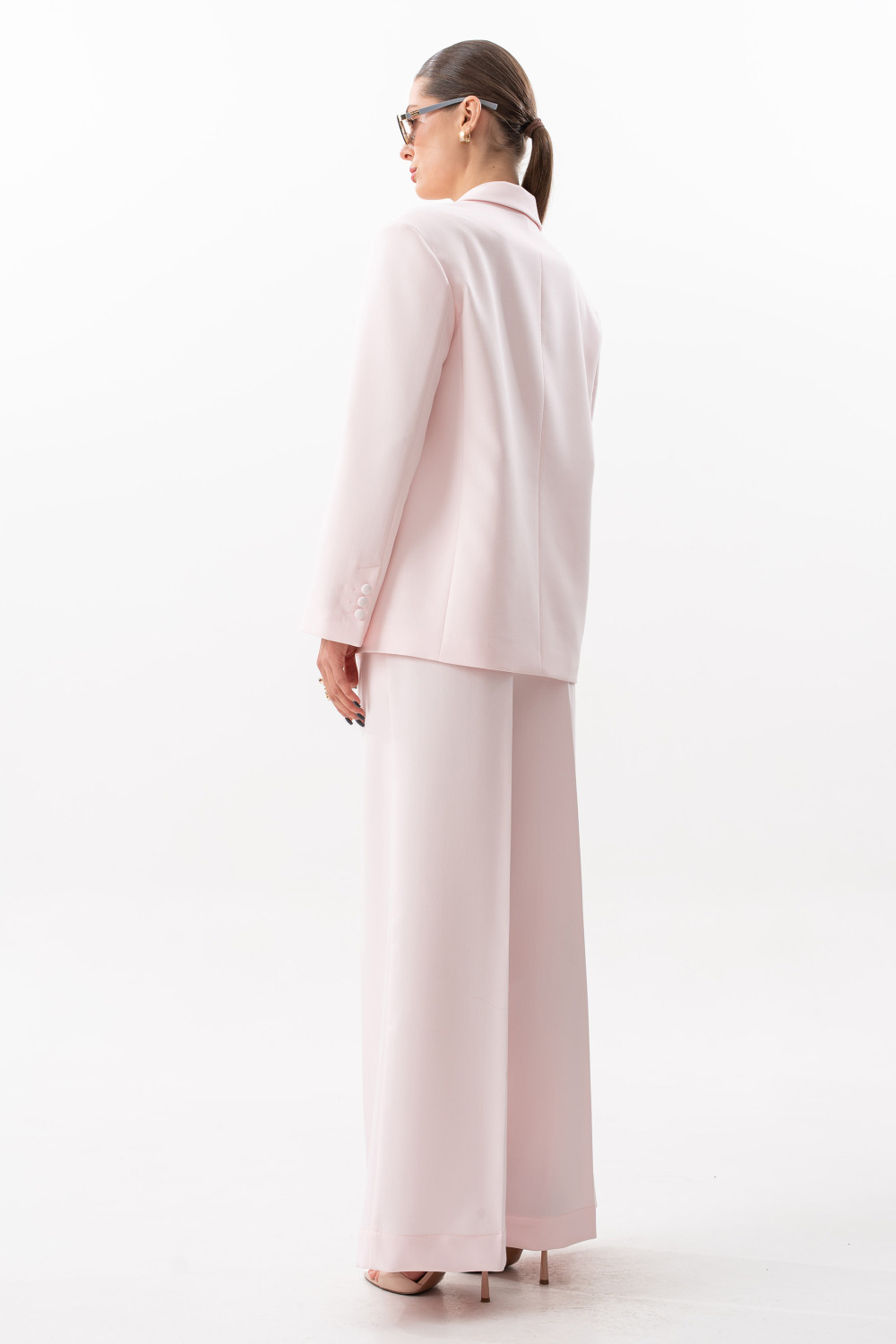 Жакет прямого силуэта, с увеличенной линией плеч, с отрезным бочком, на левой полочке листочка. Жакет на поливискозной подкладке. Спереди прорезные карманы с клапаном. Спинка со средним швом, отрезным бочком. Воротник пиджачного типа с отложным лацканом. Рукав втачной, двухшовный, со шлицей и пуговицами.