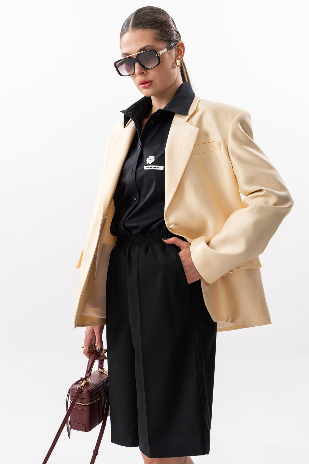 Жакет прямого силуэта, с увеличенной линией плеч, с отрезным бочком, на левой полочке листочка. Жакет на поливискозной подкладке. Спереди прорезные карманы с клапаном. Спинка со средним швом, отрезным бочком. Воротник пиджачного типа с отложным лацканом. Рукав втачной, двухшовный, со шлицей и пуговицами. Длина жакета по среднему шву спинки 68 см. Длина рукава от удлиненного плеча 60 см.