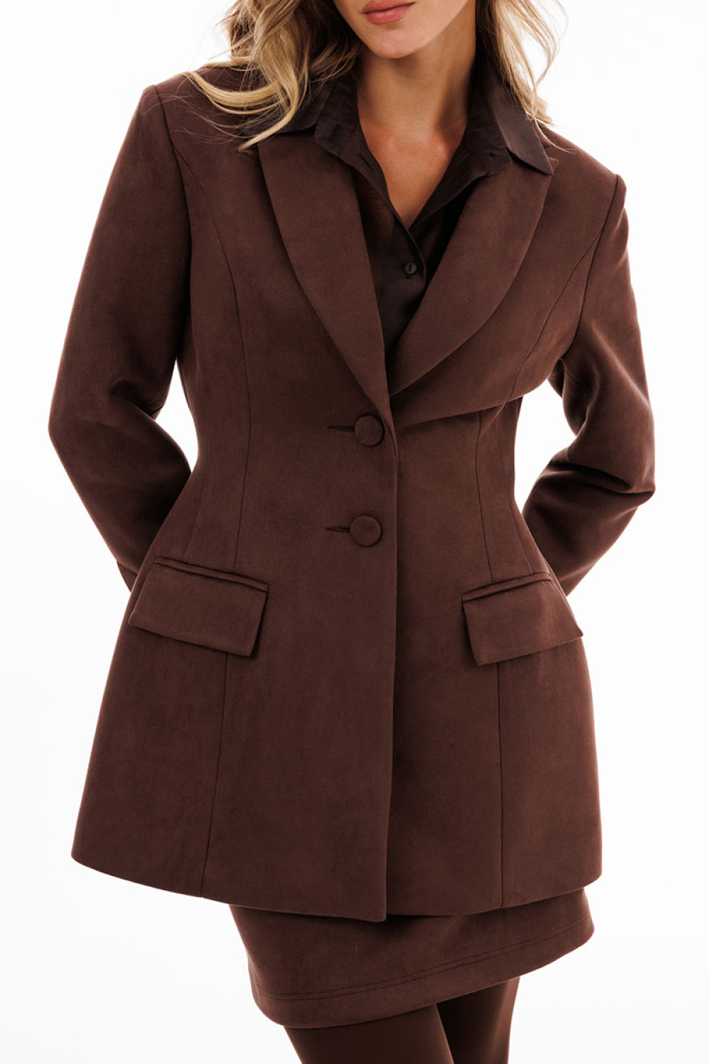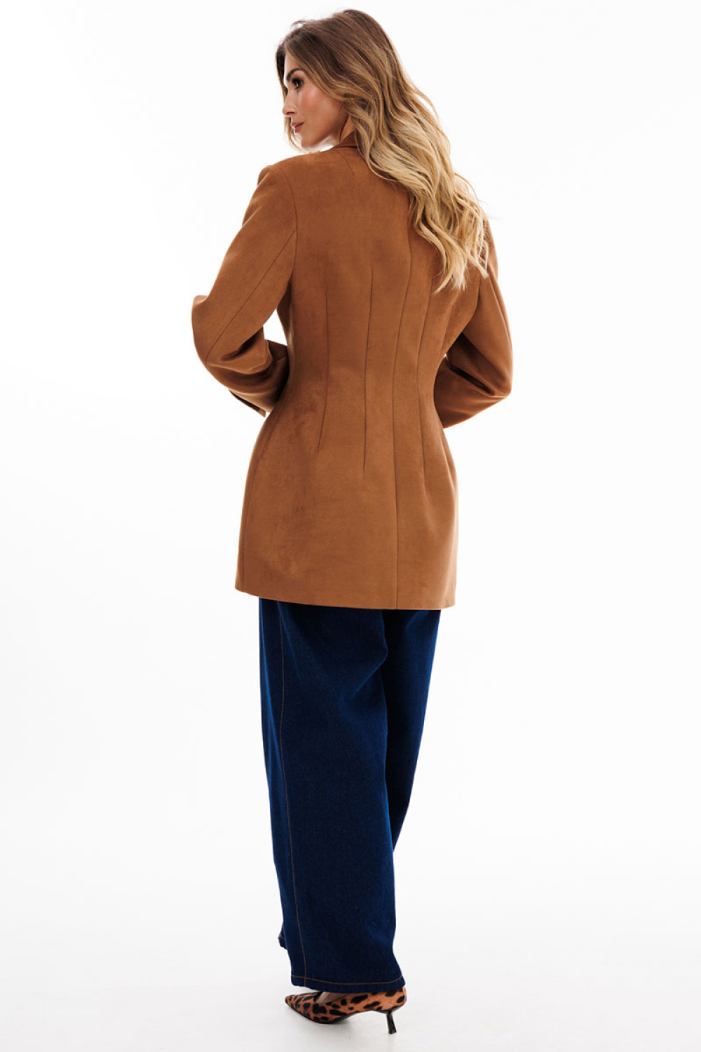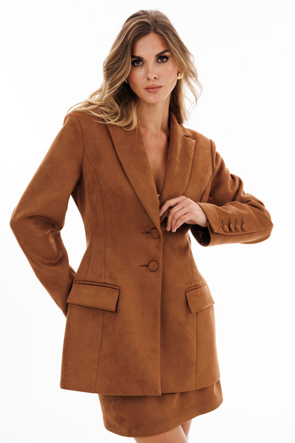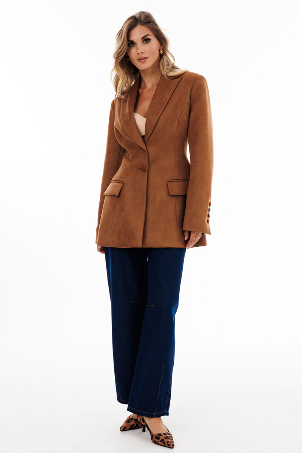 Жакет выполнен из плотной искуственной замши. Жакет Х-обраного силуэта, длиной ниже линии бедер. Спереди рельефы от проймы до низа, прорезные карманы с клапанами и центральная бортовая застежка на пуговицы. Воротник пиджачного типа. На спинке средний шов. Плечевой шов удлинен. Рукав втачной, двухшовный, по низу заднего шва шлица с застежкой на пуговицы. Жакет на притачной по низу подкладке.